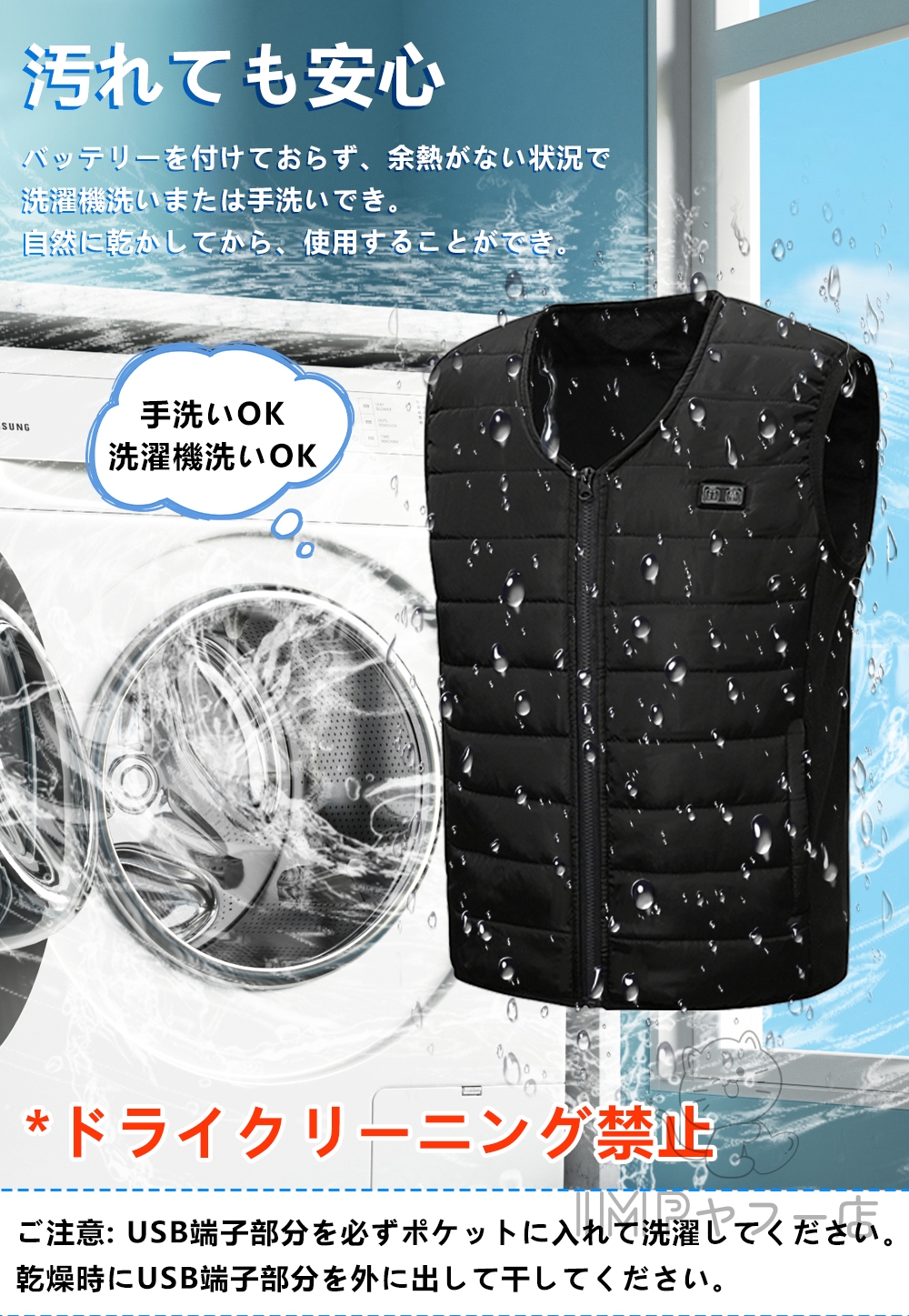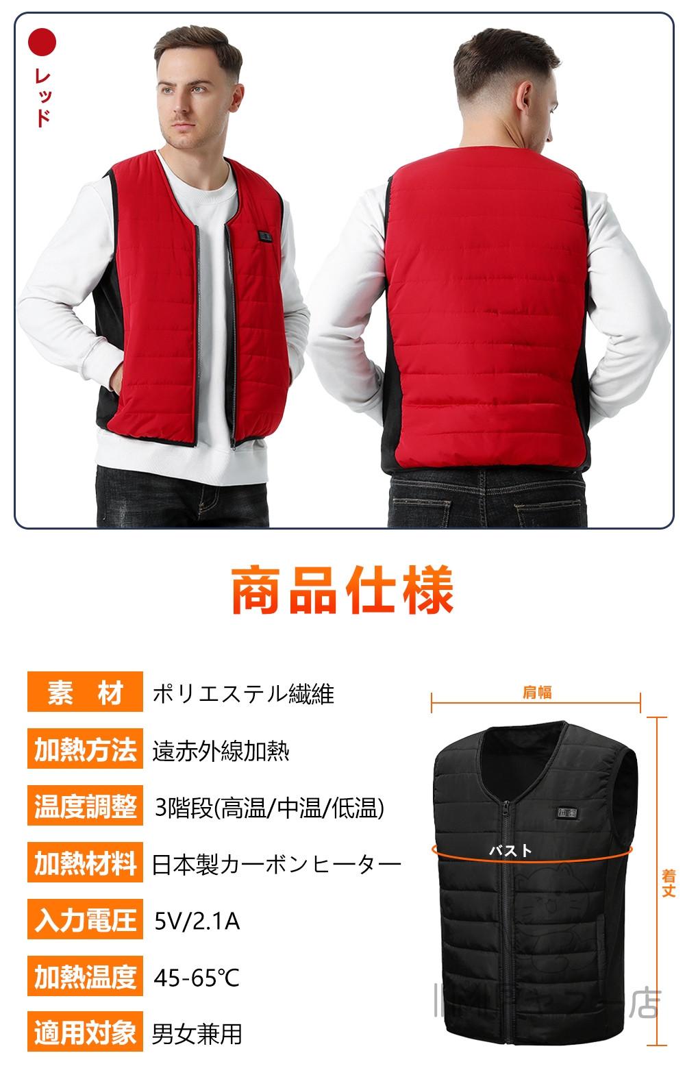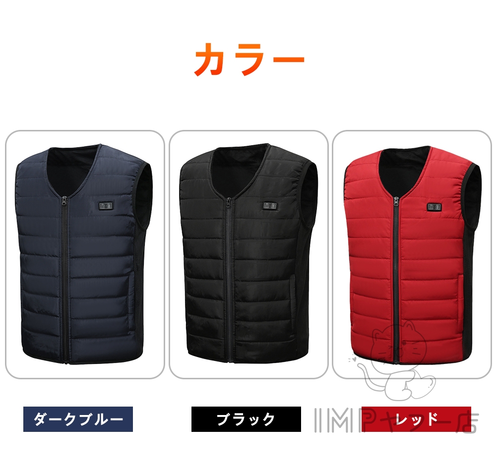 ふんわりした柔らかい中綿入り、電源を入れず、普通に着ていても暖かいです。ヒーターインナーベストですが水洗いが可能です。汚れてしまっても定期的にお手入れできるので、いつでも清潔にご使用いただけます。(バッテリーを取り外し、余熱がない状況で手洗いで洗えます。)軽量で肌に優しい素材で作られており、着心地が良いです。ベストの素材は快適で肌触りが良く、シワになりにくく、手入れが簡単で、洗濯機で洗濯することができます(洗濯ネットに入れてください)または手洗いできます。