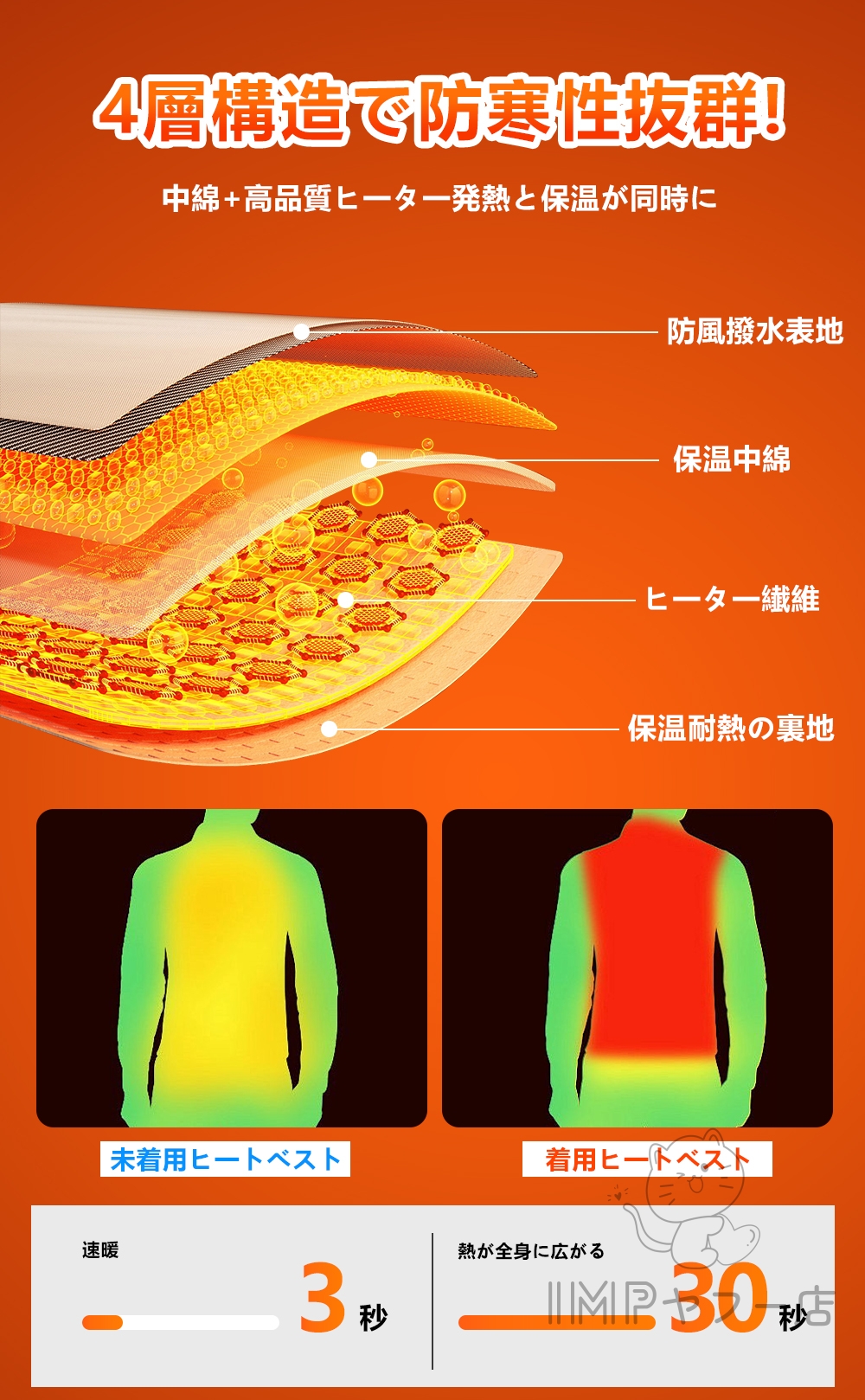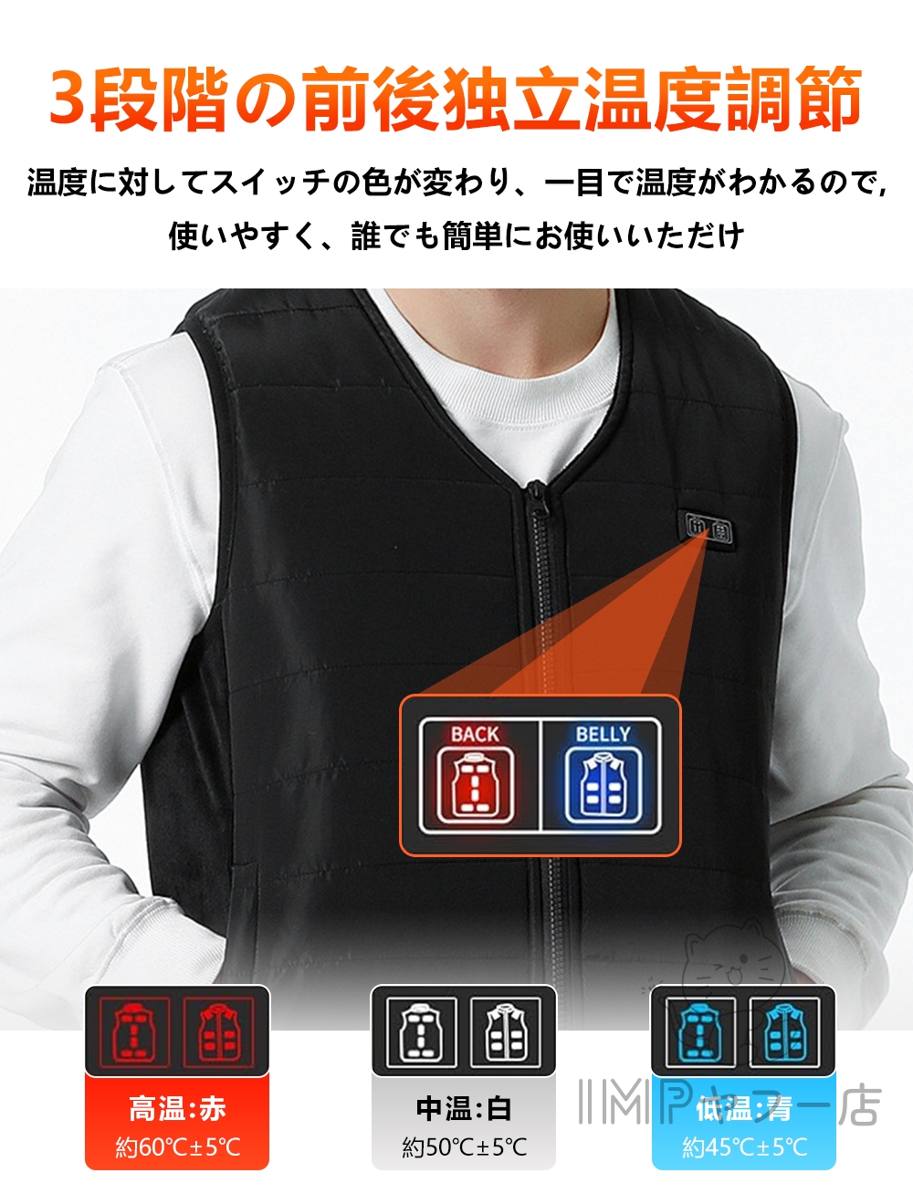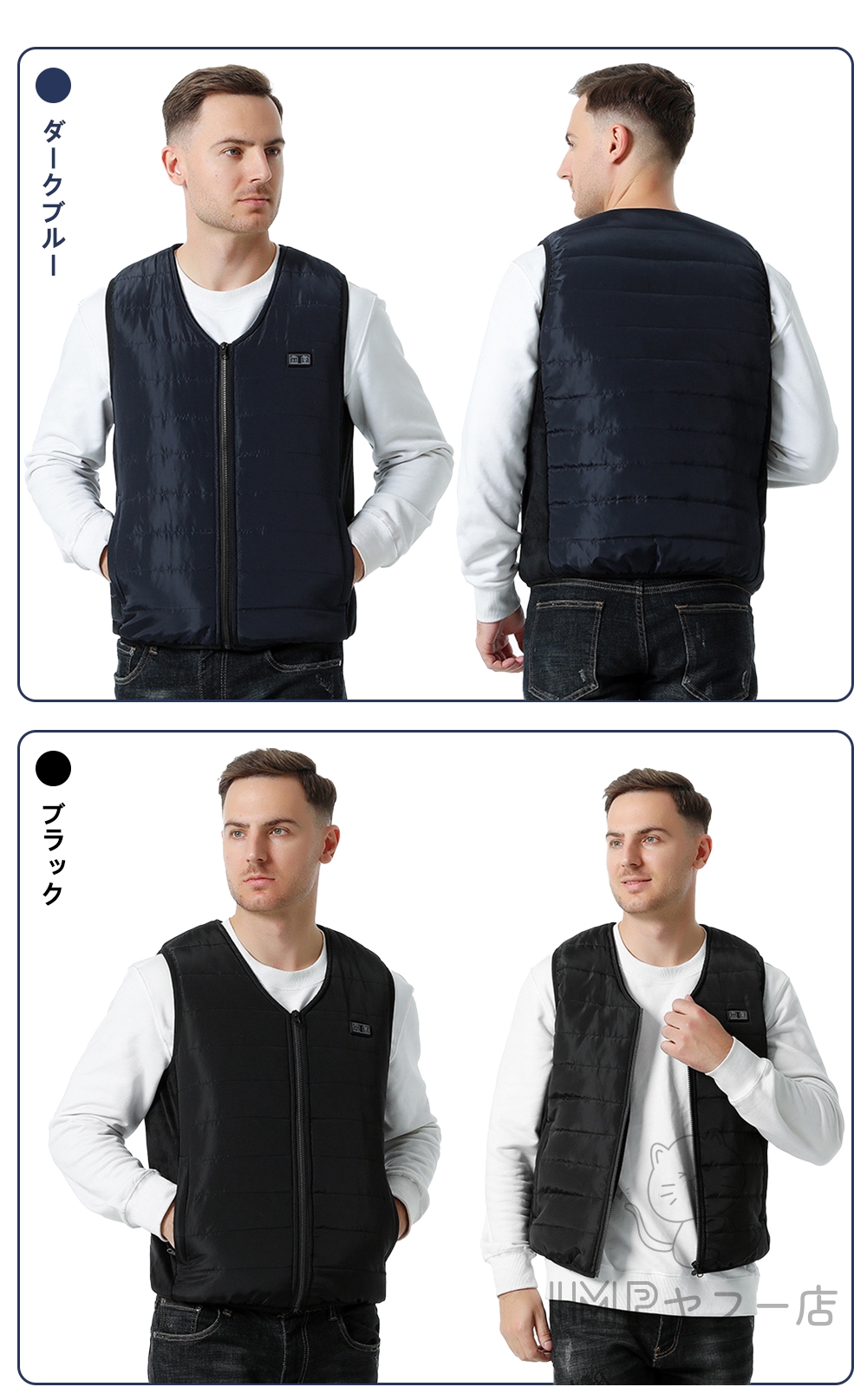 ふんわりした柔らかい中綿入り、電源を入れず、普通に着ていても暖かいです。ヒーターインナーベストですが水洗いが可能です。汚れてしまっても定期的にお手入れできるので、いつでも清潔にご使用いただけます。(バッテリーを取り外し、余熱がない状況で手洗いで洗えます。)軽量で肌に優しい素材で作られており、着心地が良いです。ベストの素材は快適で肌触りが良く、シワになりにくく、手入れが簡単で、洗濯機で洗濯することができます(洗濯ネットに入れてください)または手洗いできます。