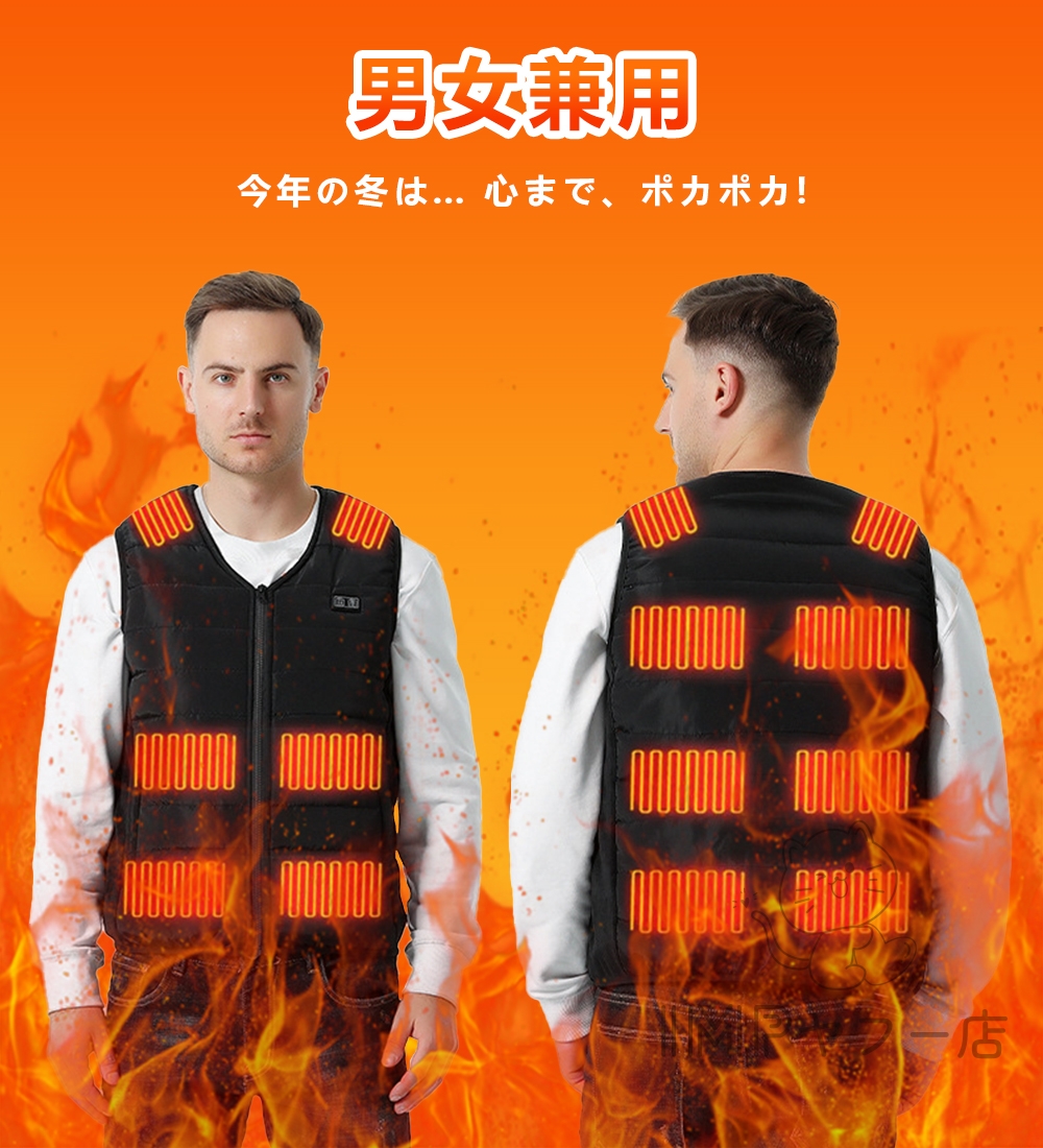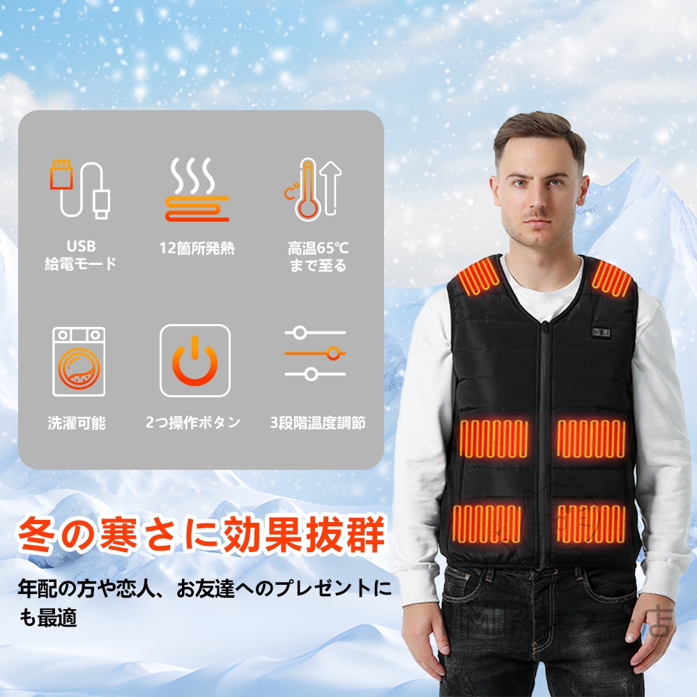 電熱ベスト 日本製12つヒーター 加熱ベスト 日本製繊維ヒーター電熱ジャケット ベスト中綿 3段階温度調節 3s速暖 前後独立制御 洗濯機対応 防寒インナー 洗える