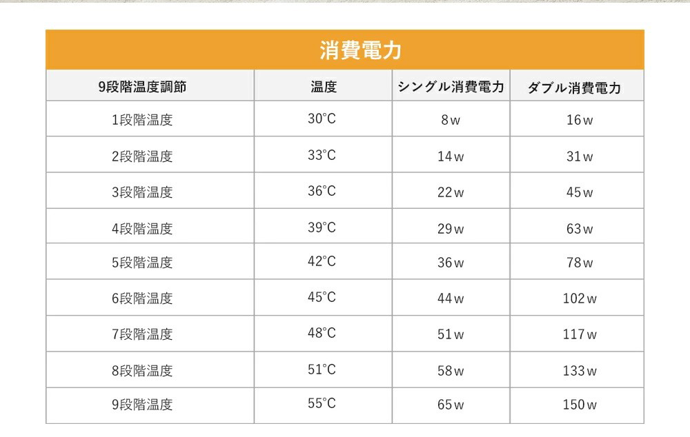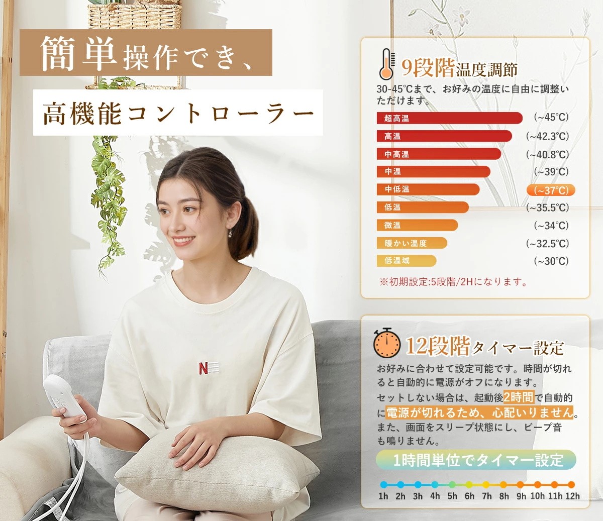 機能:9段階温度調節機能(30℃-55℃まで)/12段階タイマー機能(1時間ごとに1回調整する)