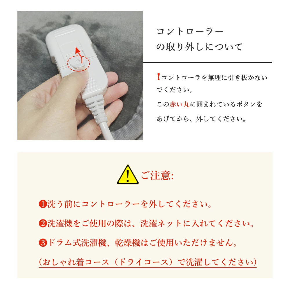 ※ご使用前は本体を広げてヒーター線をまっすくに整える。ご使用のたびに、毛布が平らで、内部のヒーター線がねじれたり重なったりしていなことをご確認ください。洗濯後は特にご注意ください。異常な重なりやねじれは局部的な過熱を引き起こし、故障や事故の原因となる恐れがあります。