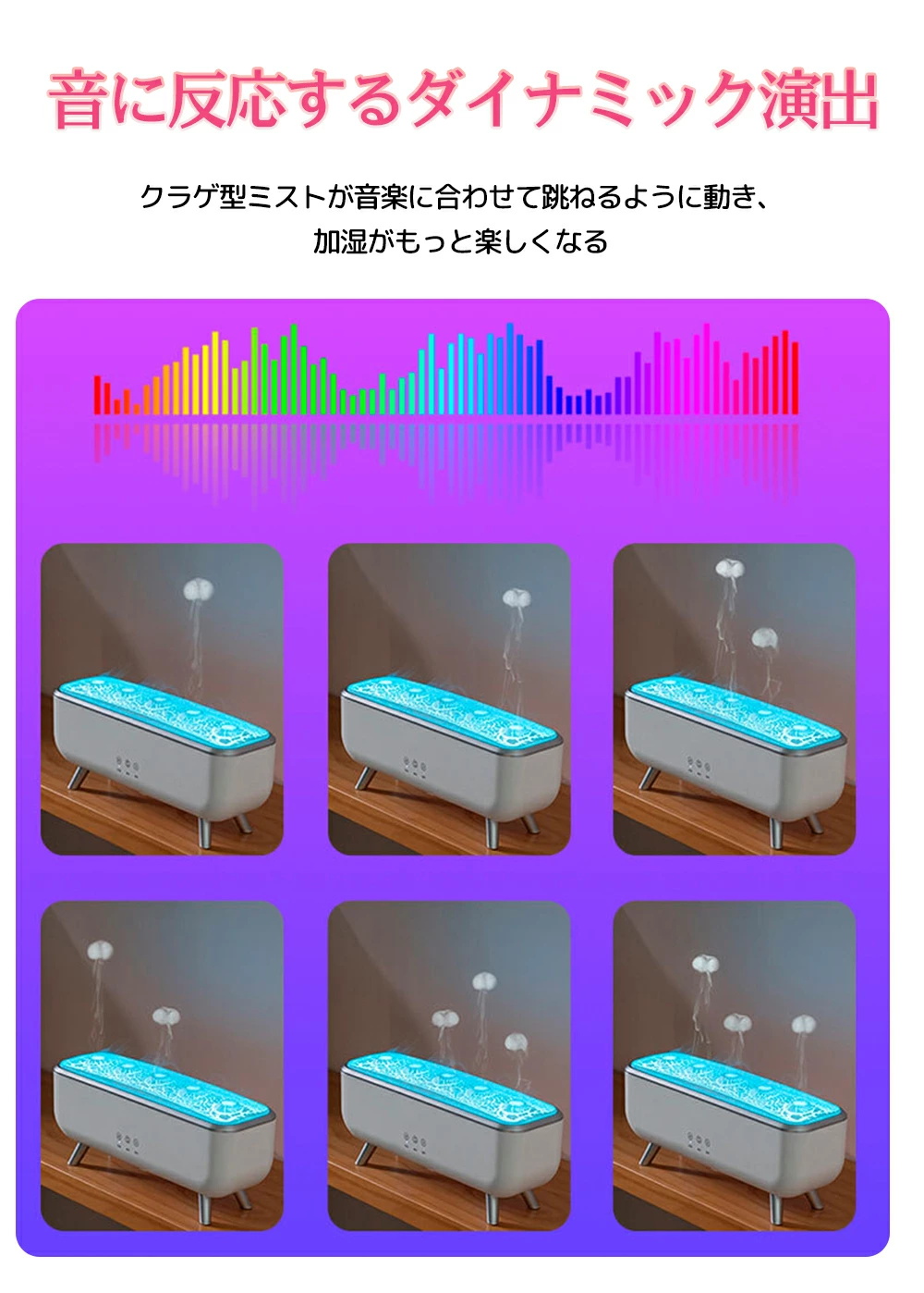 ●音に反応する霧化機能:音楽のリズムや周囲の音に反応し、霧がリズムに合わせて動くことで、音と視覚が融合したユニークな体験を提供します。