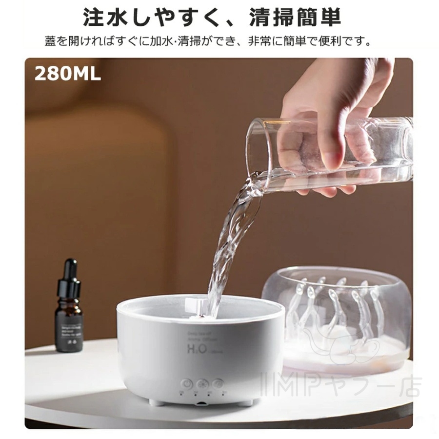 加湿器の運転時には細かいミストを放出し、水中を優雅に泳ぐクラゲのダイナミックな効果を再現する。ミストは気流に乗ってゆっくりと浮動し、周囲の光と組み合わせてエレガントな視覚体験を生み出し、空間にドリーミーな雰囲気を加える。加湿という実用的な機能と、デコレーションとしての観賞性を両立させてる。