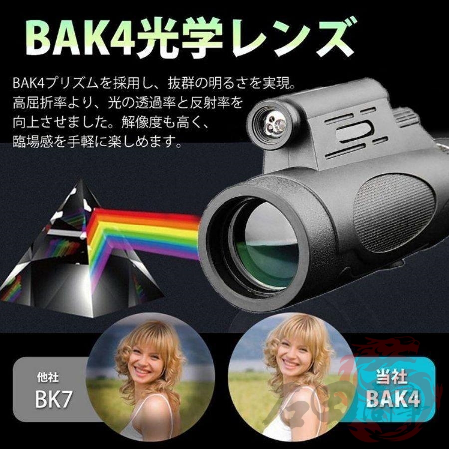 大型のBAK-4プリズムレンズと多層コーティングレンズのコーティングが組み込まれているため、単眼の重要な機能が強化され、優れた光透過率と明るさが確保され、視野が明るくクリアになり、鮮明な画像が得られます。