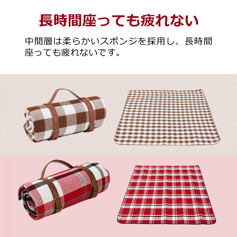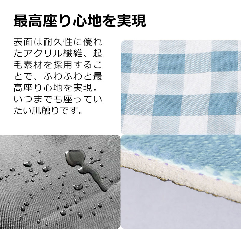 表面のアクリル繊維と中間層のスポンジ素材と裏面の防水PEVA素材の構造で、3層の厚手仕様です。長時間を座っていても快適な優しい座り心地を実現しました。表面は耐久性に優れたアクリル繊維、起毛素材を採用することで、ふわふわと最高座り心地を実現。いつまでも座っていたい肌触りです。中間層は柔らかいスポンジを採用し、長時間座っても疲れないです。裏地は防水のPEVA素材で地面や草からの湿気を防いでくれますので、湿った地面や草の上でも安心して座れます。通気性、耐磨耗性にも優れて引っ張っても割れないです。汚れても水ですぐに洗い流せるので便利♪付属のハンドストラップで携帯性も抜群!ちょっとした外出でも、かさばることなく持ち歩けます。3サイズ選択可能!テント内や野外使用はもちろん、ピクニックマットとしてテーブルでの使用も可能です。