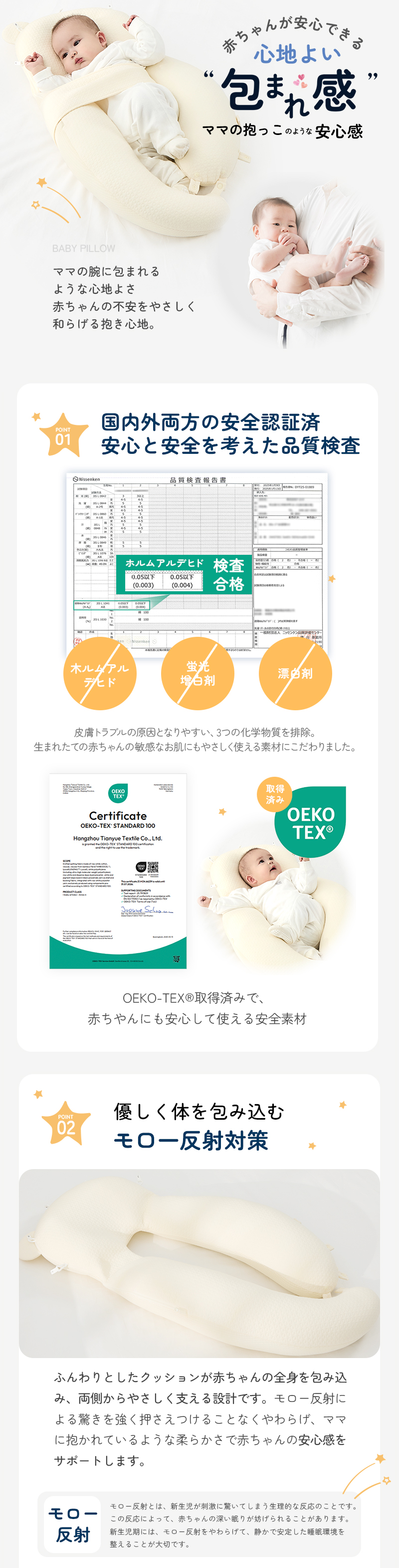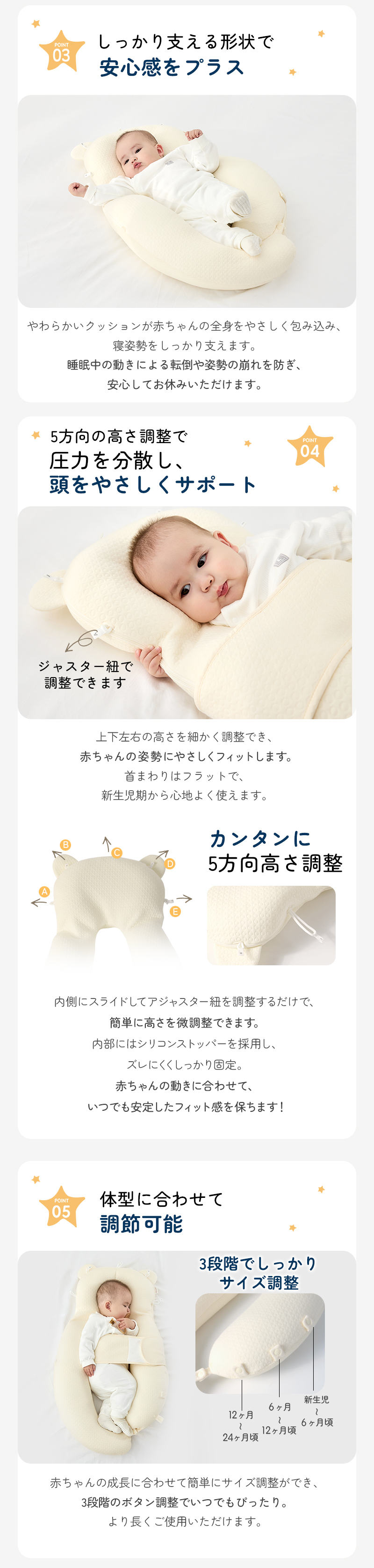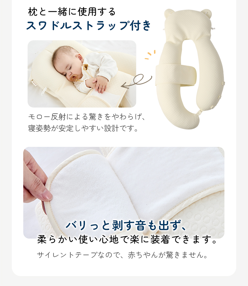 使い方の目安:新生児から。成長に合わせてサイズを3段階で調整できます。就寝時やお昼寝時の向き癖サポート・モロー反射対策の補助としてご使用ください。