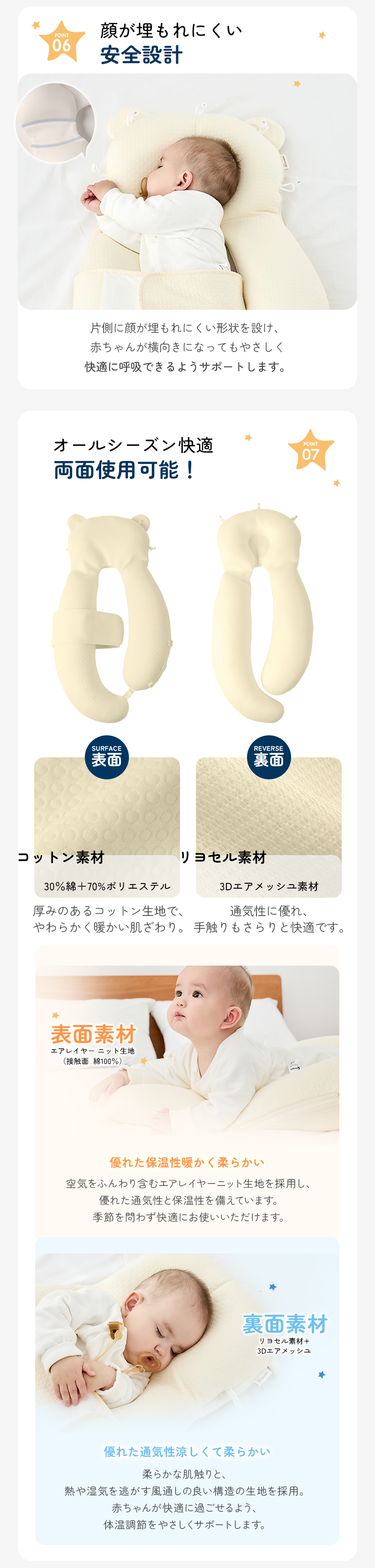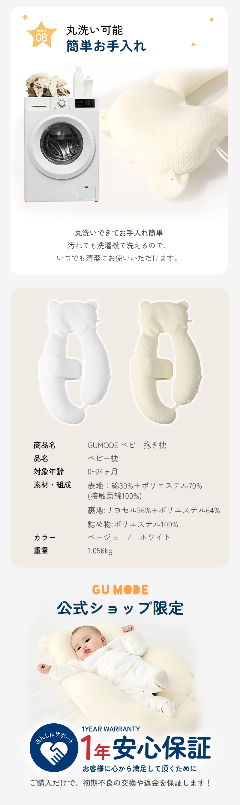 丸洗いOK: カバーはもちろん、本体も洗濯機(ネット使用)で洗えます。吐き戻しや汗も気にせず、いつでも清潔。
