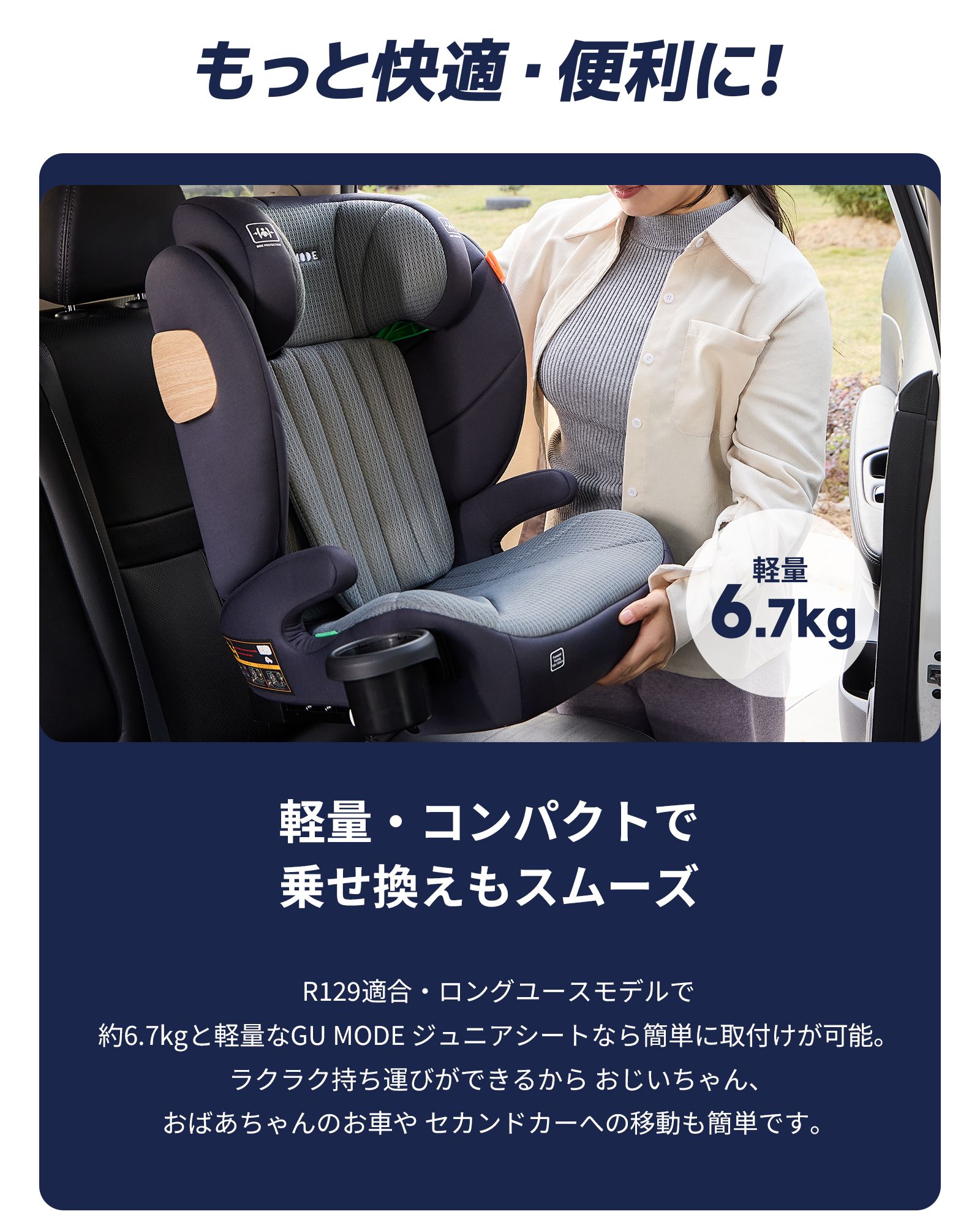 ![]() GU MODE ジュニアシート R129適合 15ヶ月~12歳 保温保冷ホルダー付 高さ調節 5年保証 |