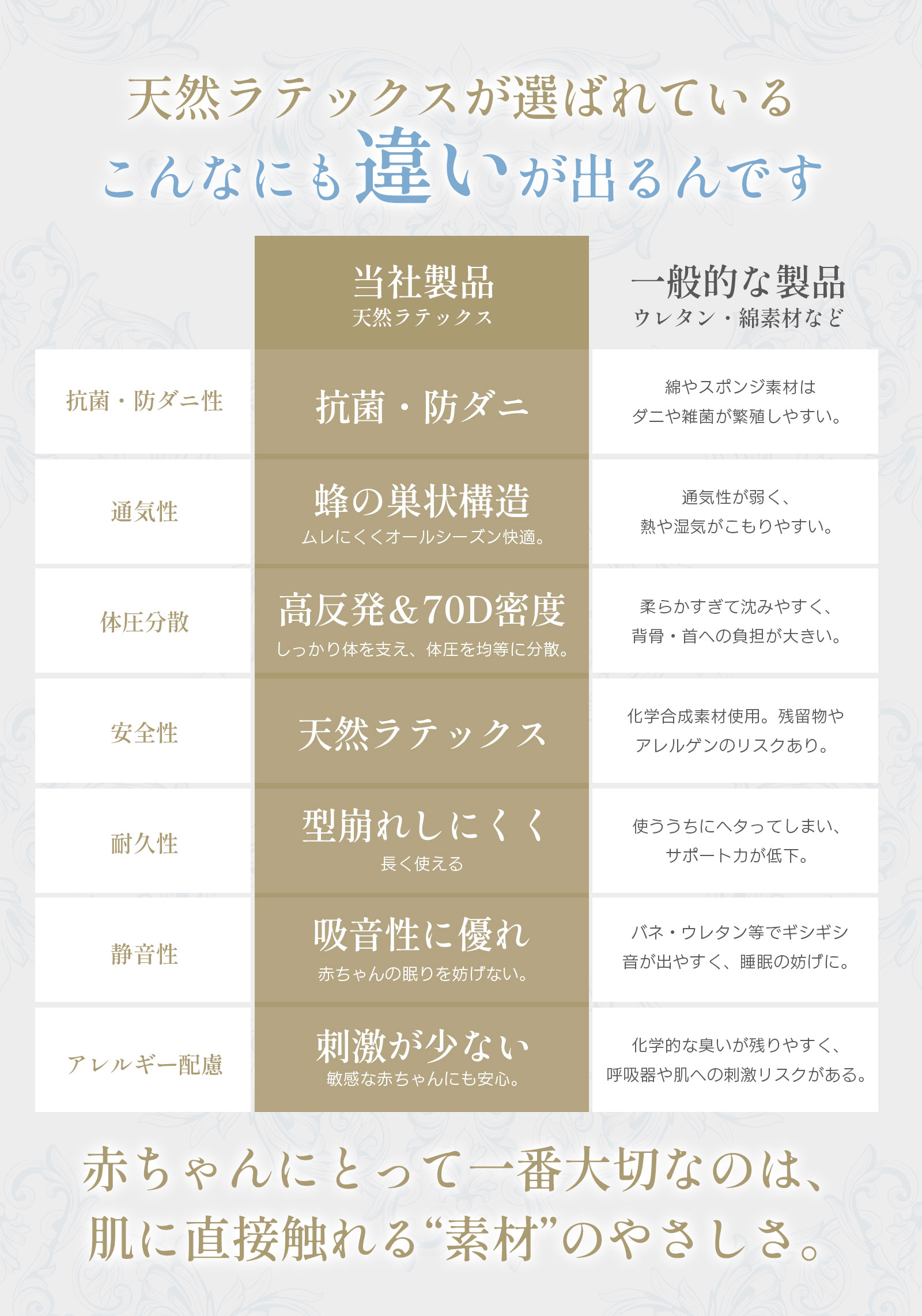 ラテックスの弾力性により、赤ちゃんが寝返りを打っても音が響かず、静かで安心な眠りの空間に。
