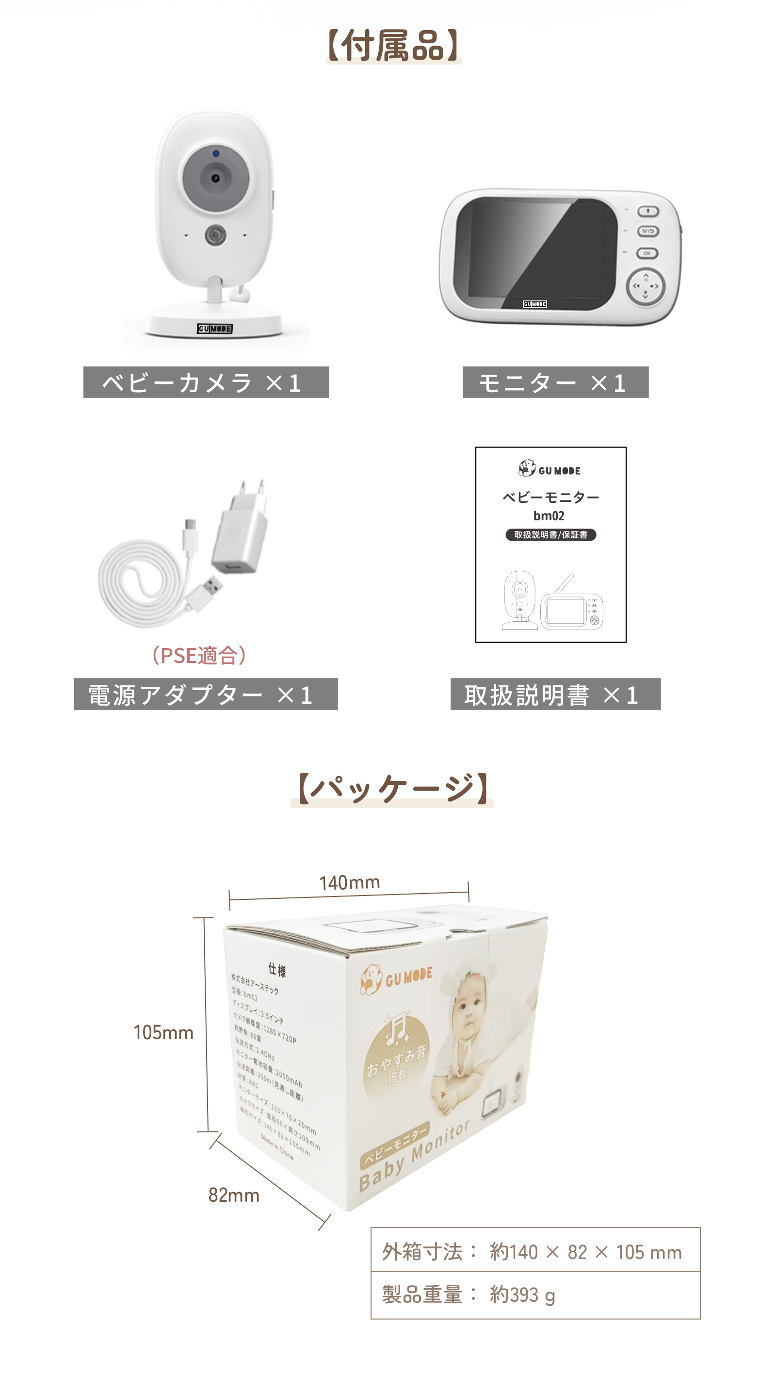 主要機能:VOX(音声検知)/ナイトビジョン/子守唄再生/温度センサー&警報/授乳リマインダー/