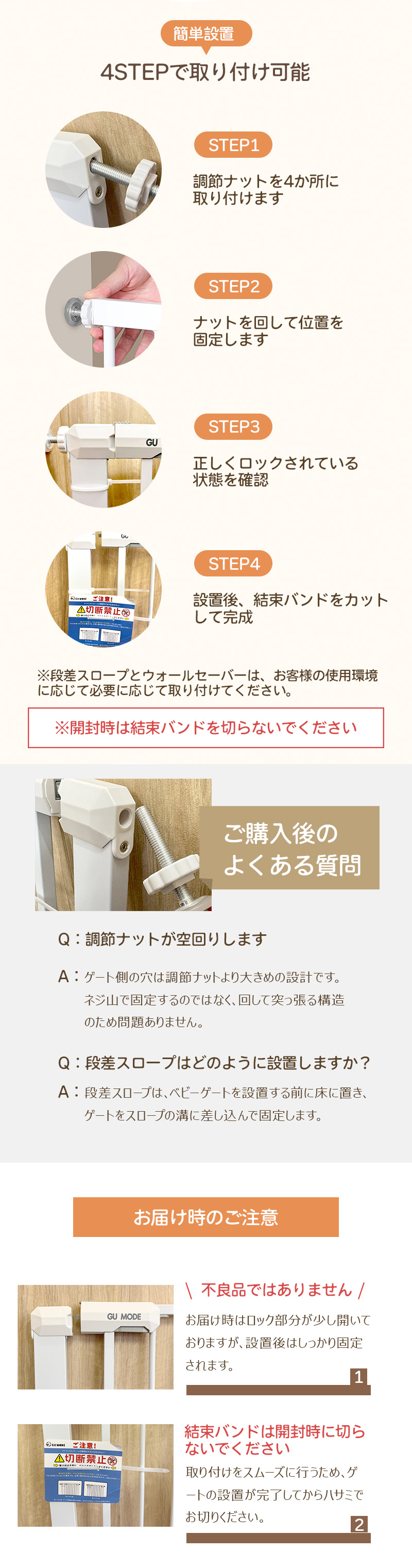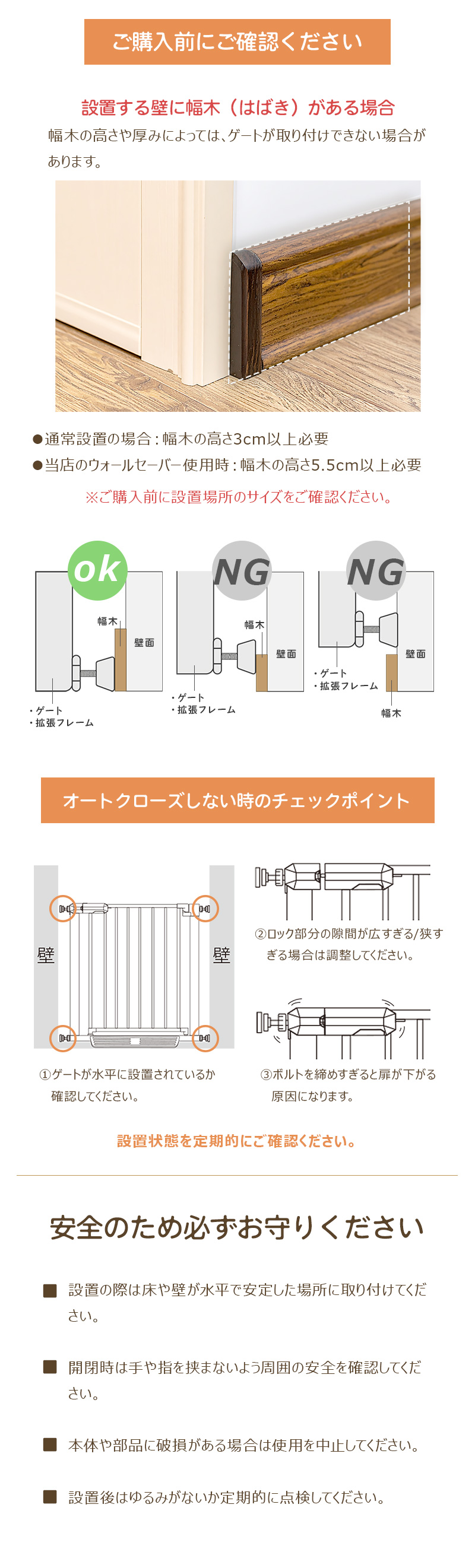 ・事故防止のため、お子様が階段付近に必ず目を離さないようご注意ください。また、非常に強い衝撃によりゲートが外れる可能性がありますが、これに関しても弊社では責任を負いかねますので、あらかじめご了承ください。