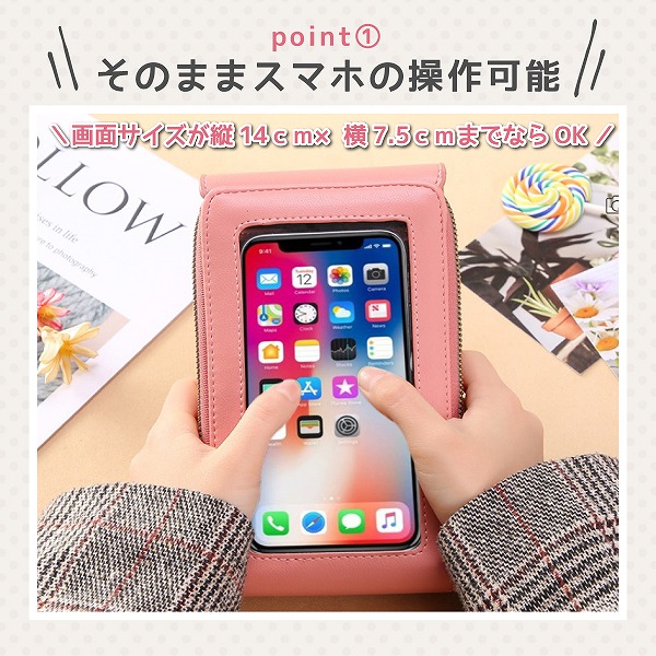 バッグの透明窓が縦14cm×横7.5cmでほとんどのスマホに対応。そのまま操作可能!