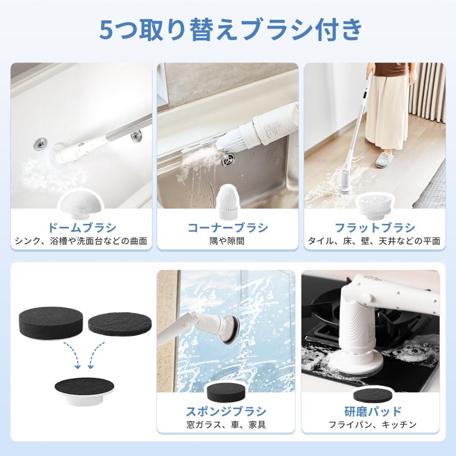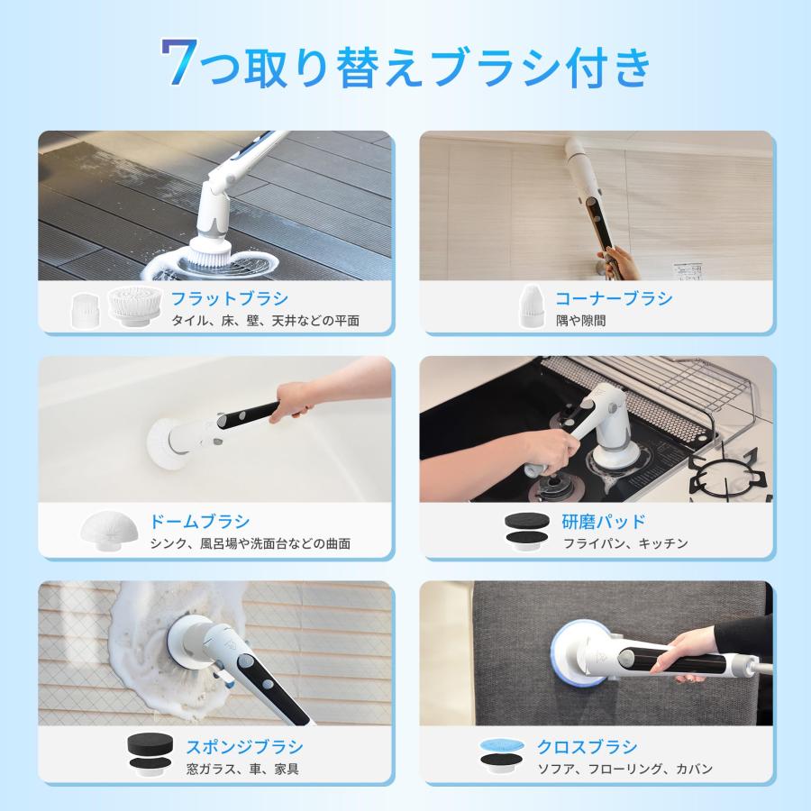 バスポリッシャー 電動お掃除ブラシ 充電式 コードレス 2500mAh大容量 防水 角度調節 伸縮ロッド 長さ調整可 お風呂掃除 9つ取り替えブラシ付き 掃除道具