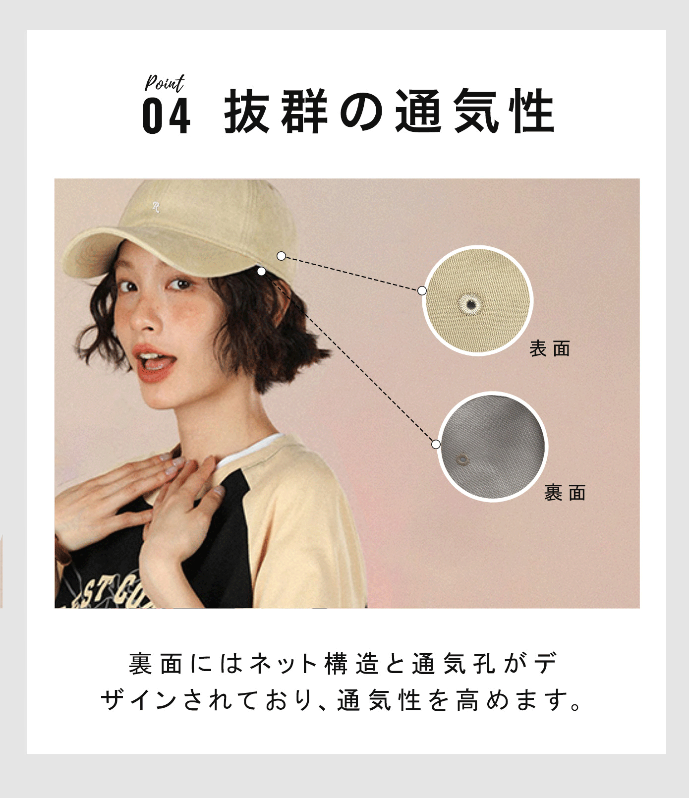 裏地には接触冷感メッシュ素材を採用。汗をかいても蒸れにくく、暑い日でも爽やかな被り心地をキープ。毎日使っても気にならない手洗い対応なのも高ポイント◎