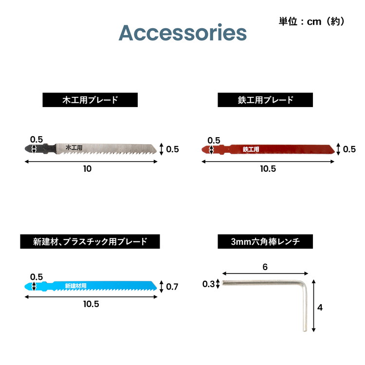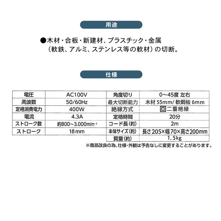 oDIY o工具 o電動工具 o10.8V oDIY女子 oDIY初心者におすすめ ◇◇ 【サイズ】約幅210×奥行70×高さ195mm 【特長】 ●変速機能付(6段階スピード) ●ブレードの交換は工具不要 ●木材・金属(軟材)・樹脂の直線、曲線切りに ●最大切断能力:木材55mm/軟鋼板6mm ●傾斜切断 左右45°まで ●連続作業にスイッチ固定ボタン ●替え刃3枚付 【仕様】 ●電圧:AC100V ●周波数:50/60Hz ●定格消費電力:400W ●電流:4.3A ●ストローク数:約800〜3000min-1 ●ストローク:18mm ●角度切り:0〜45度 左右 ●最大切断能力:木材55mm/軟鋼板6mm ●定格時間:20分 ●絶縁方式:二重絶縁 ●コード長(約):2m ●本体サイズ:長さ205×幅70×高さ200mm ●質量(約):1.5kg 【用途】 ●木材・合板・新建材、プラスチック・金属(軟鉄、アルミ、ステンレスなどの軟材)の切断 【付属品】 ●木工用ブレード・鉄工用ブレード・新建材、プラスチック用ブレード ●3mm六角棒レンチ