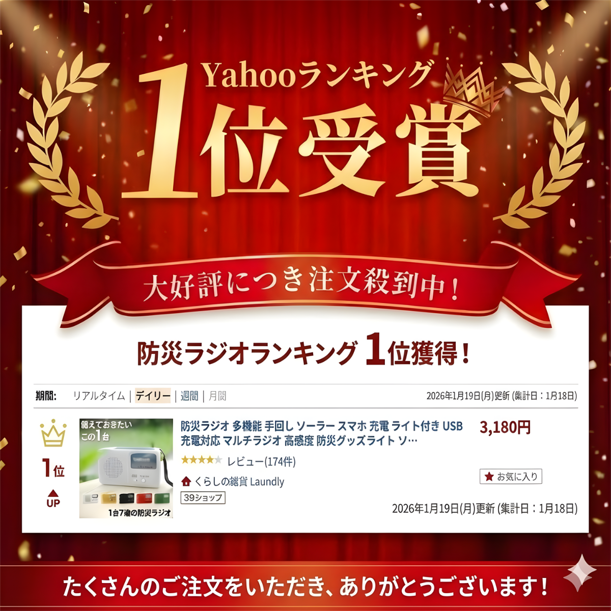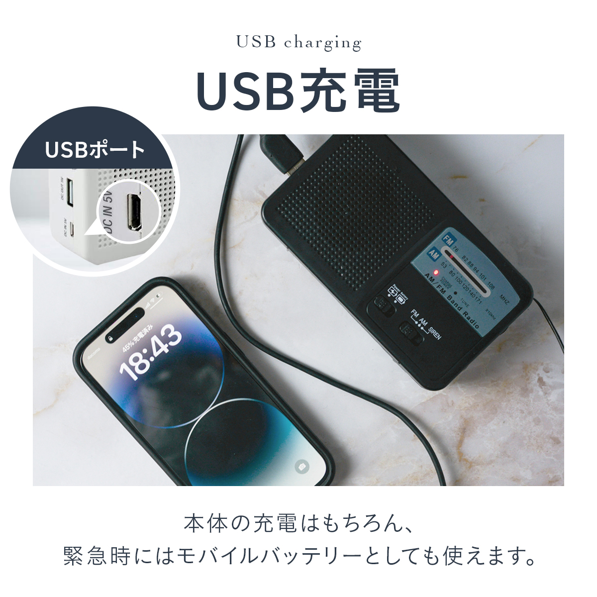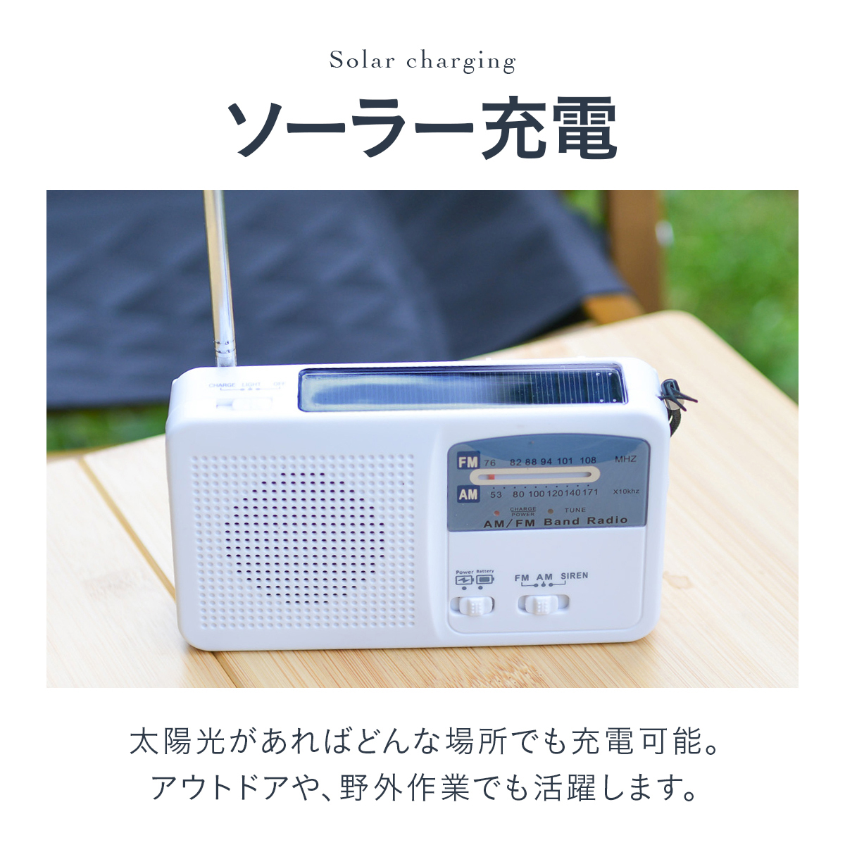 ラジオ受信範囲:(AM)522〜1650KHz・(FM)76〜108MHz、LEDライト、スマホ充電、サイレンラジオ 防災