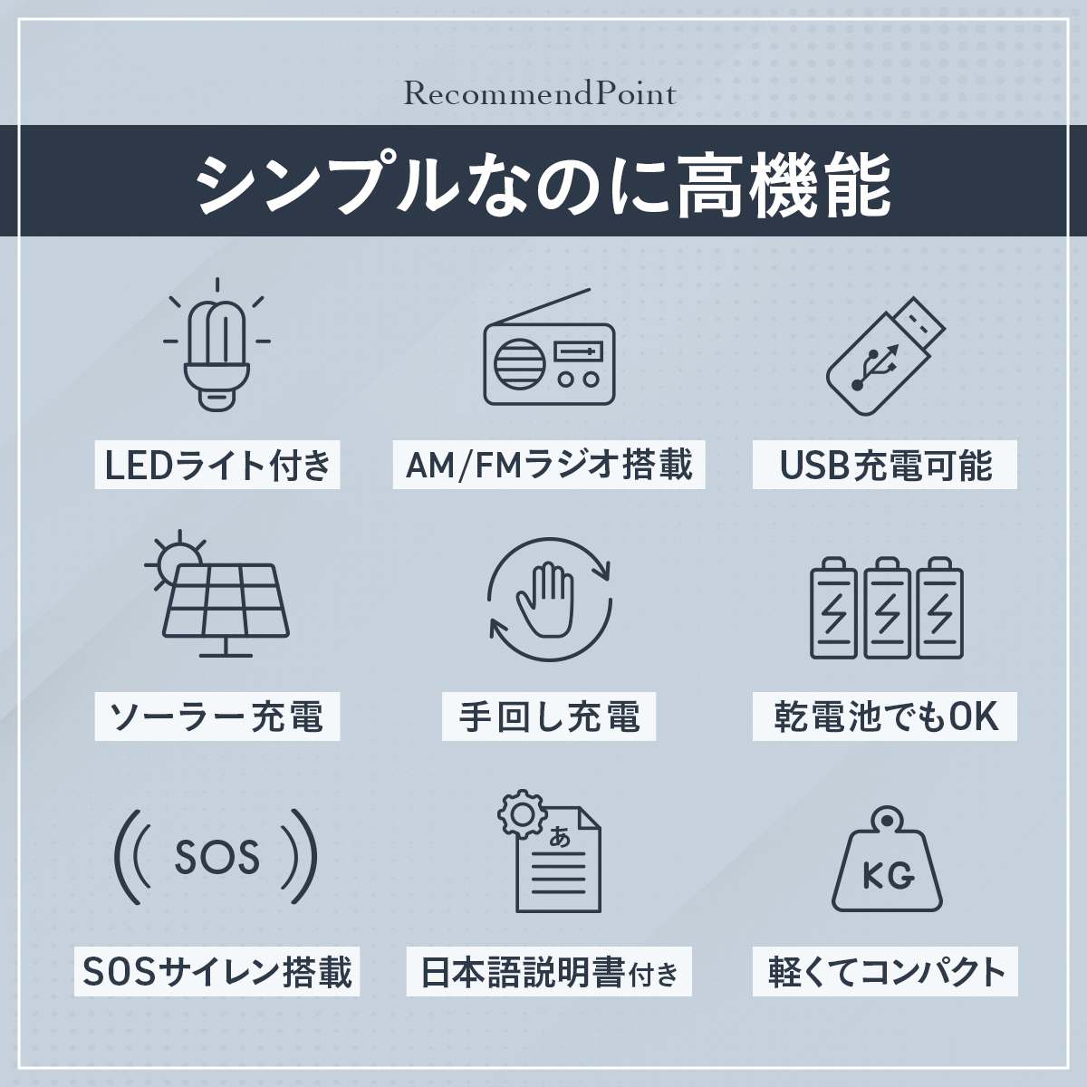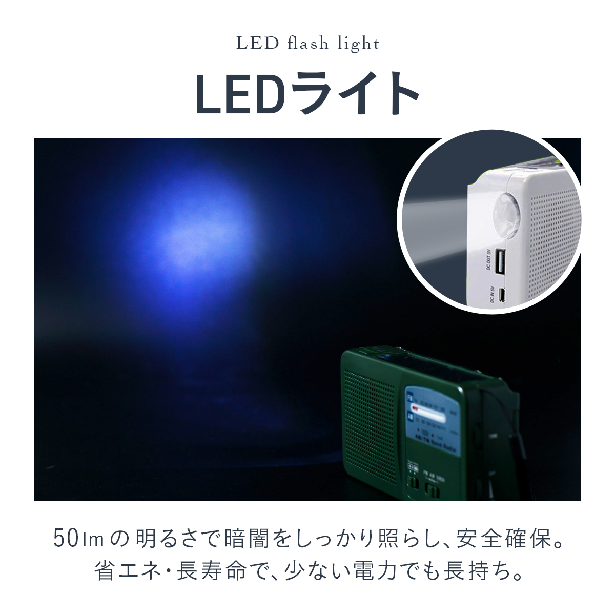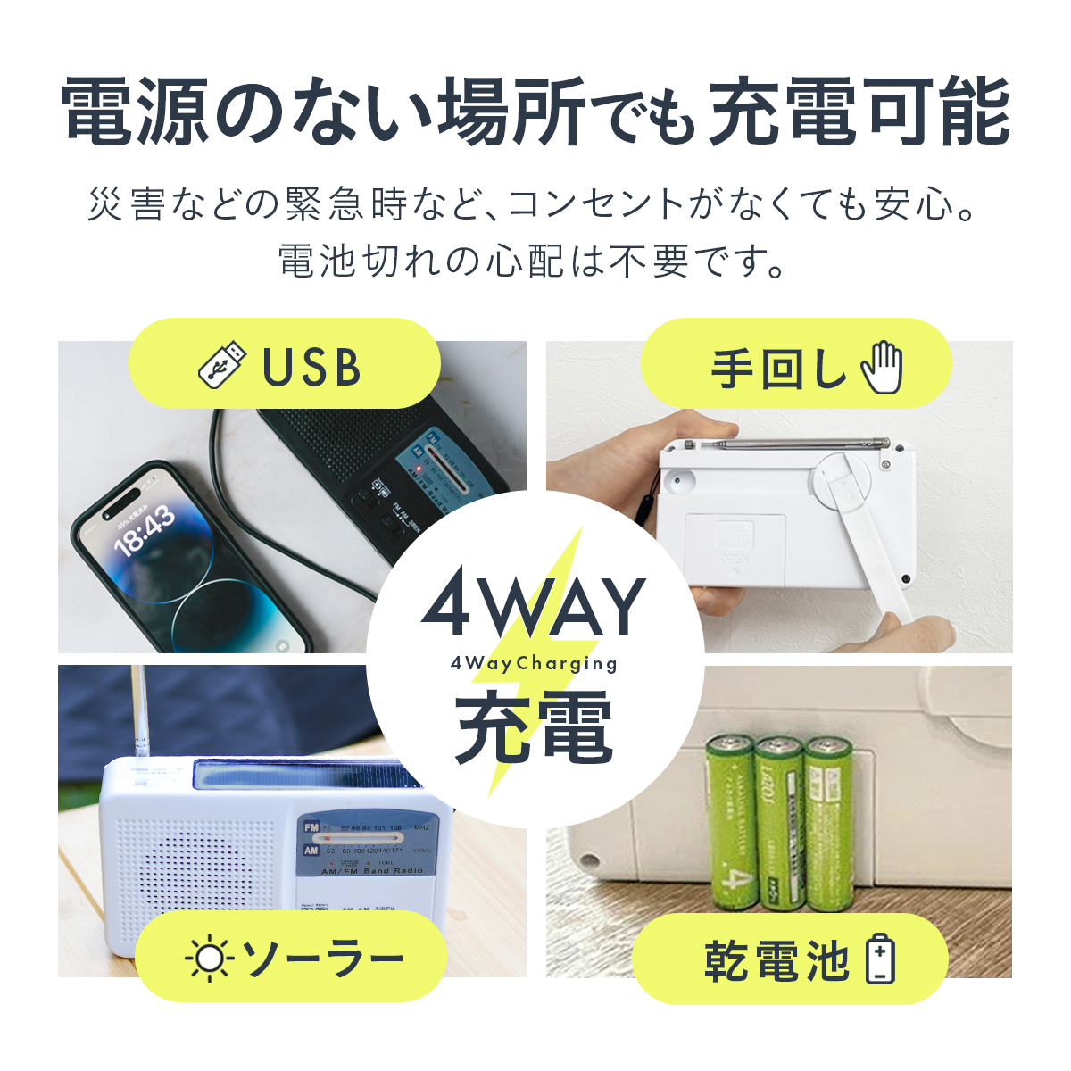 ●仕様/電源:手回し発電・USB充電・ソーラー充電・単4形アルカリ乾電池3本使用(別売)