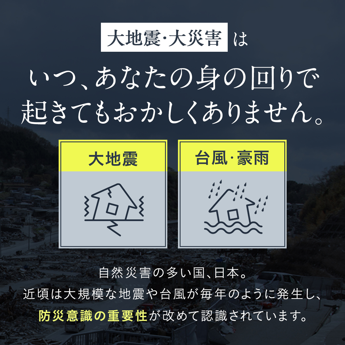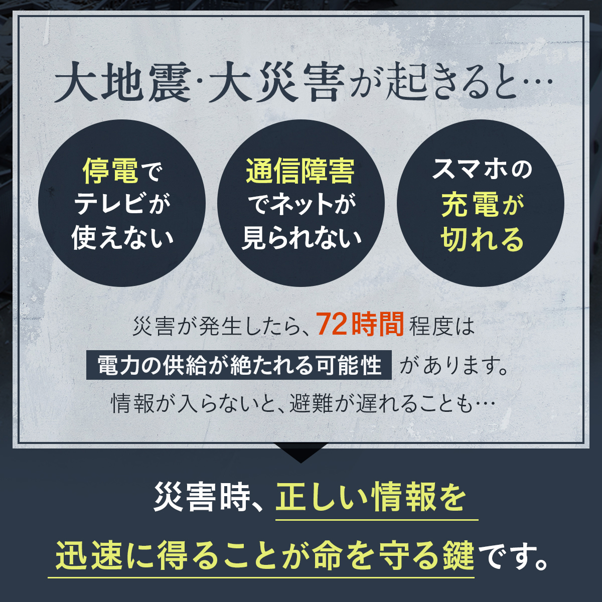 災害・停電・地震など非常時はもちろん、