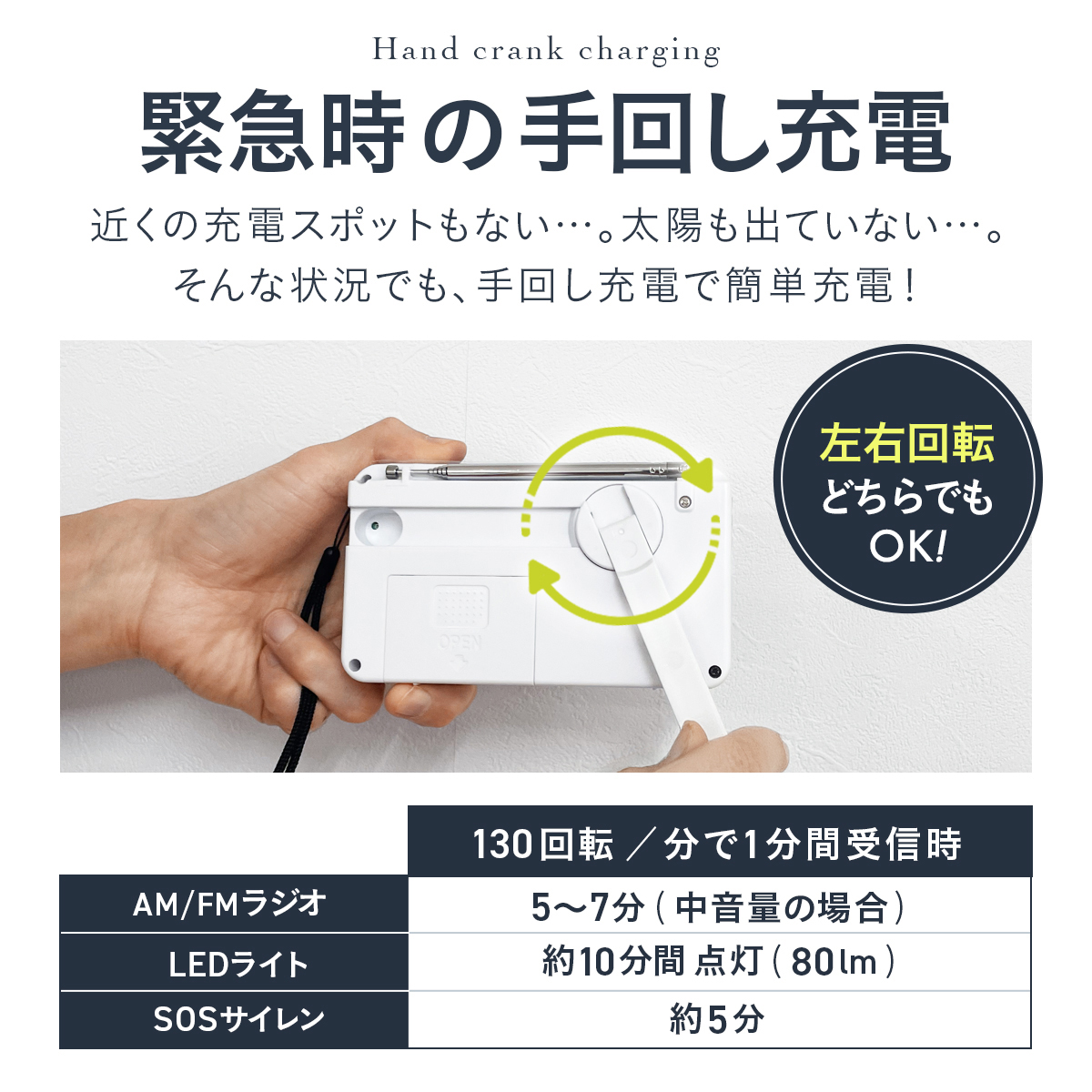 ●1分間回すと約15〜30分間ラジオやライトが使用可能。