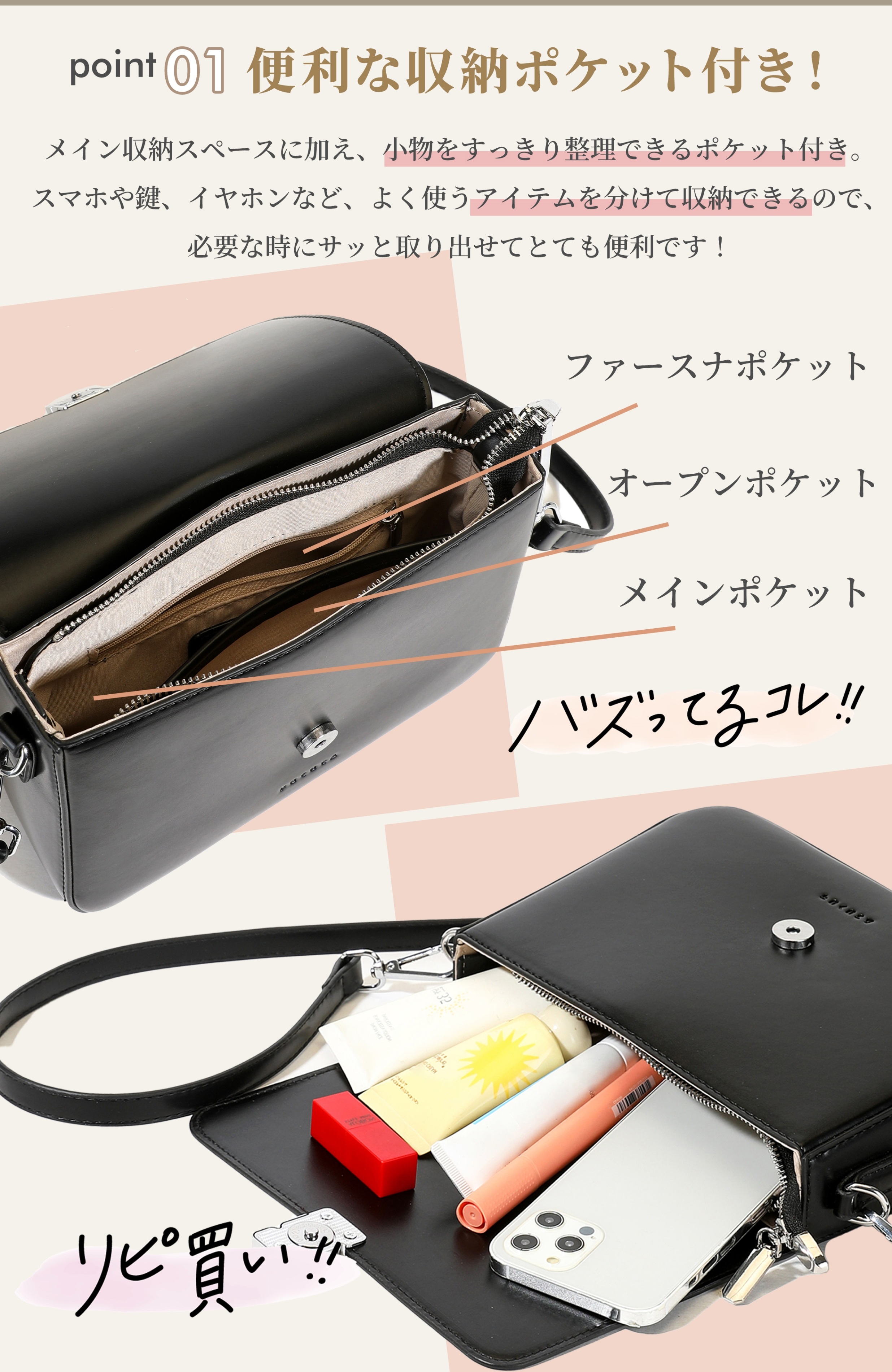 【実用的な3層構造】メイン収納+ファスナー+オープンポケットの構成で、スマホ・財布・鍵などをすっきり仕分け◎取り出しやすさも抜群!