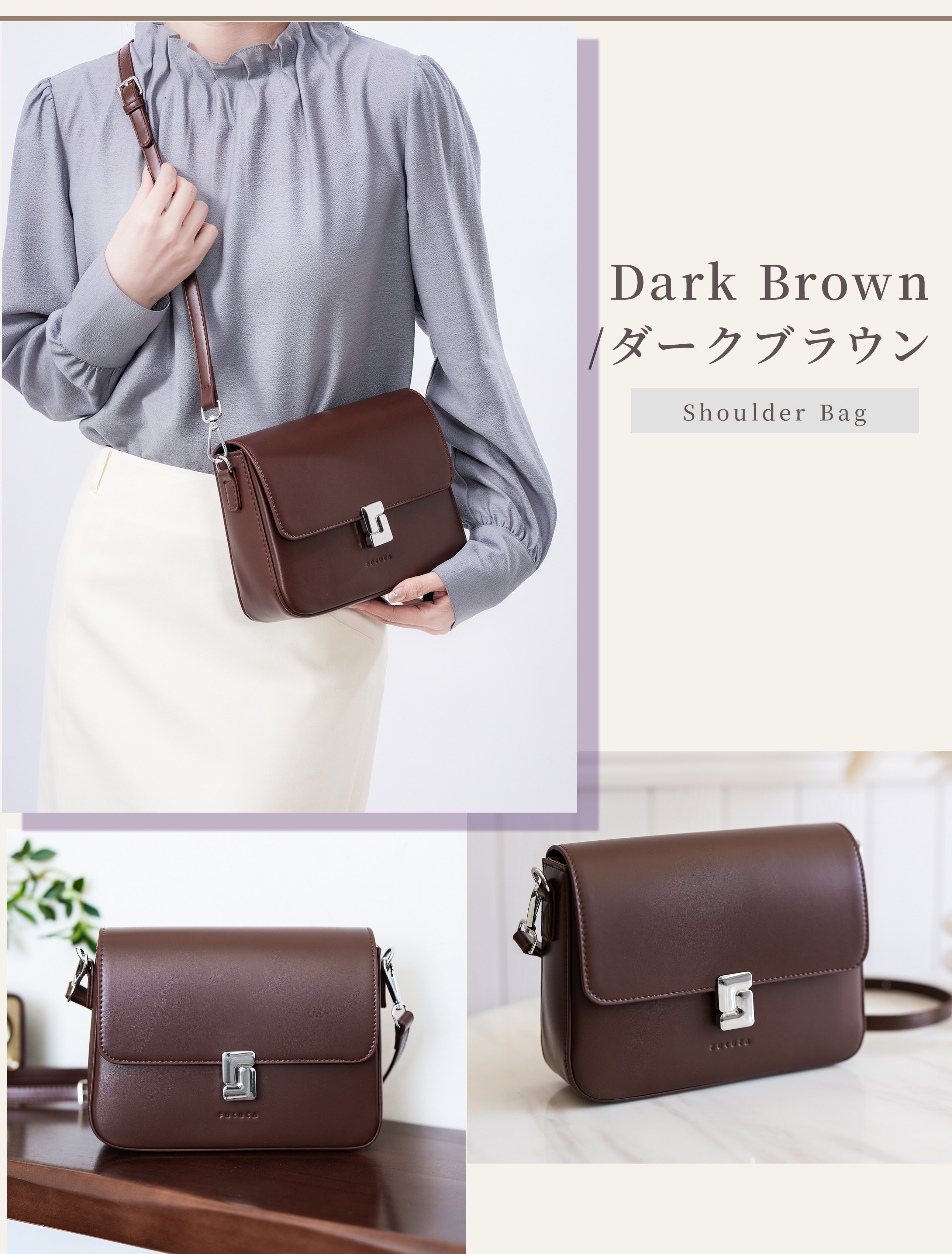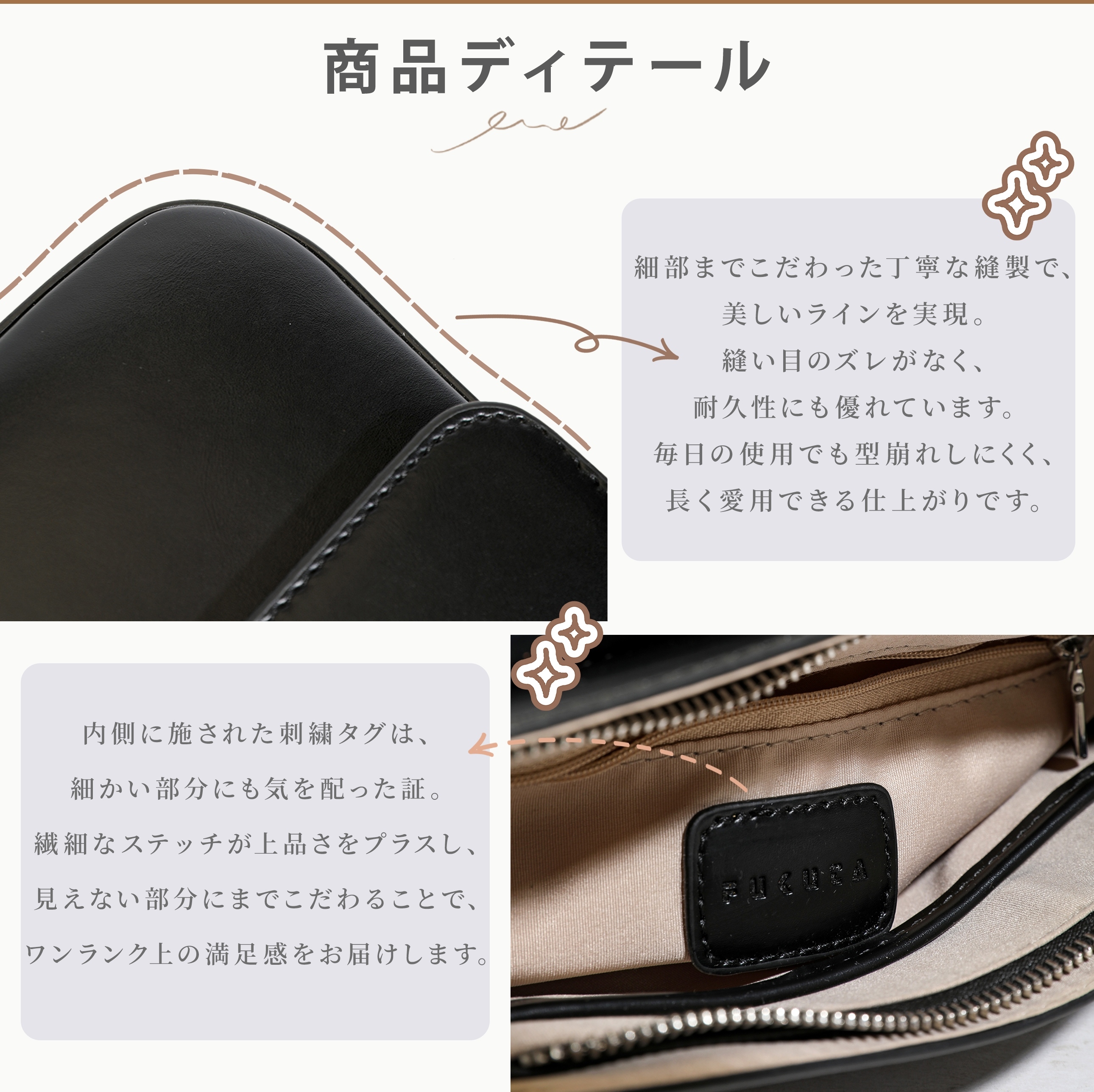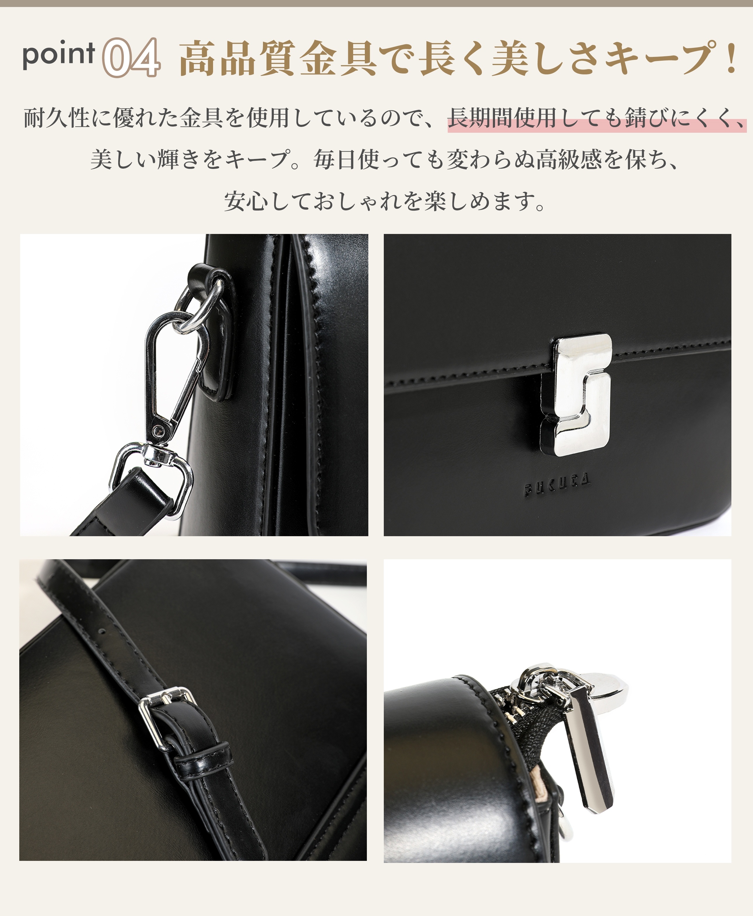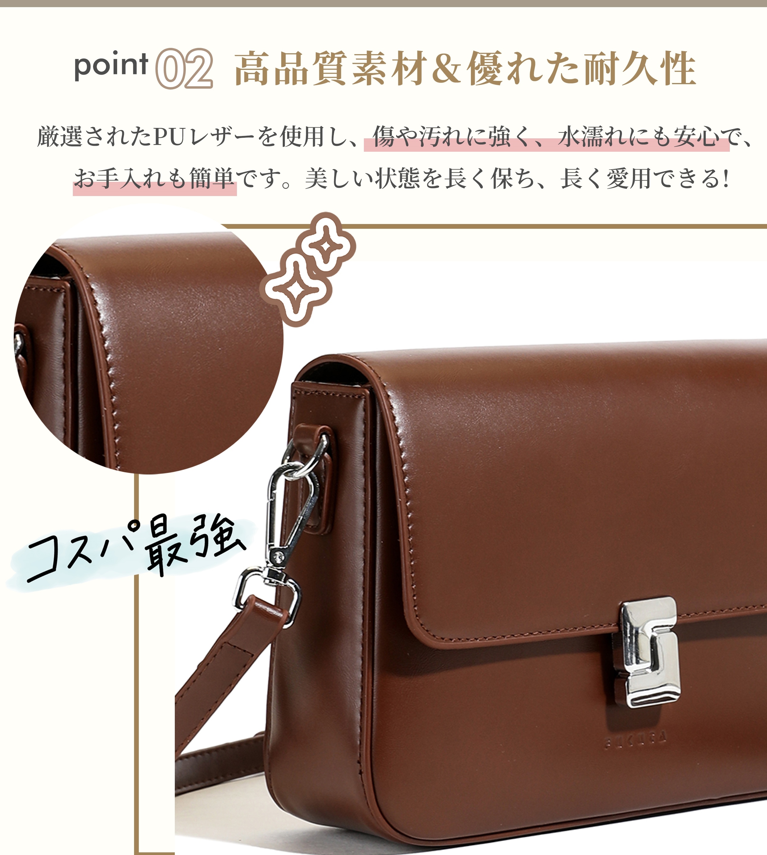 撥水PUレザー仕様で、雨の日も気軽に使えて、どんなスタイルにもすっと馴染む万能デザイン