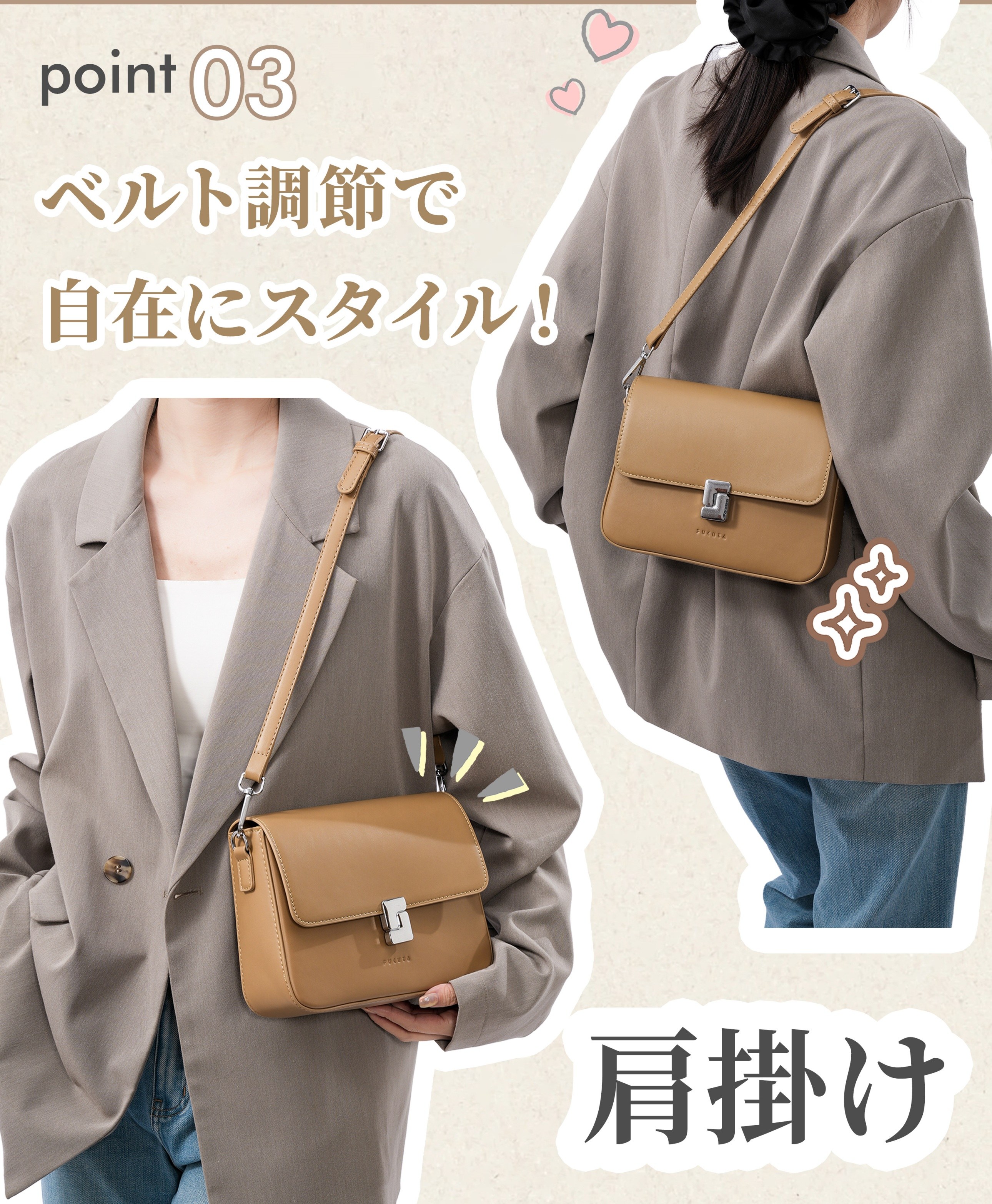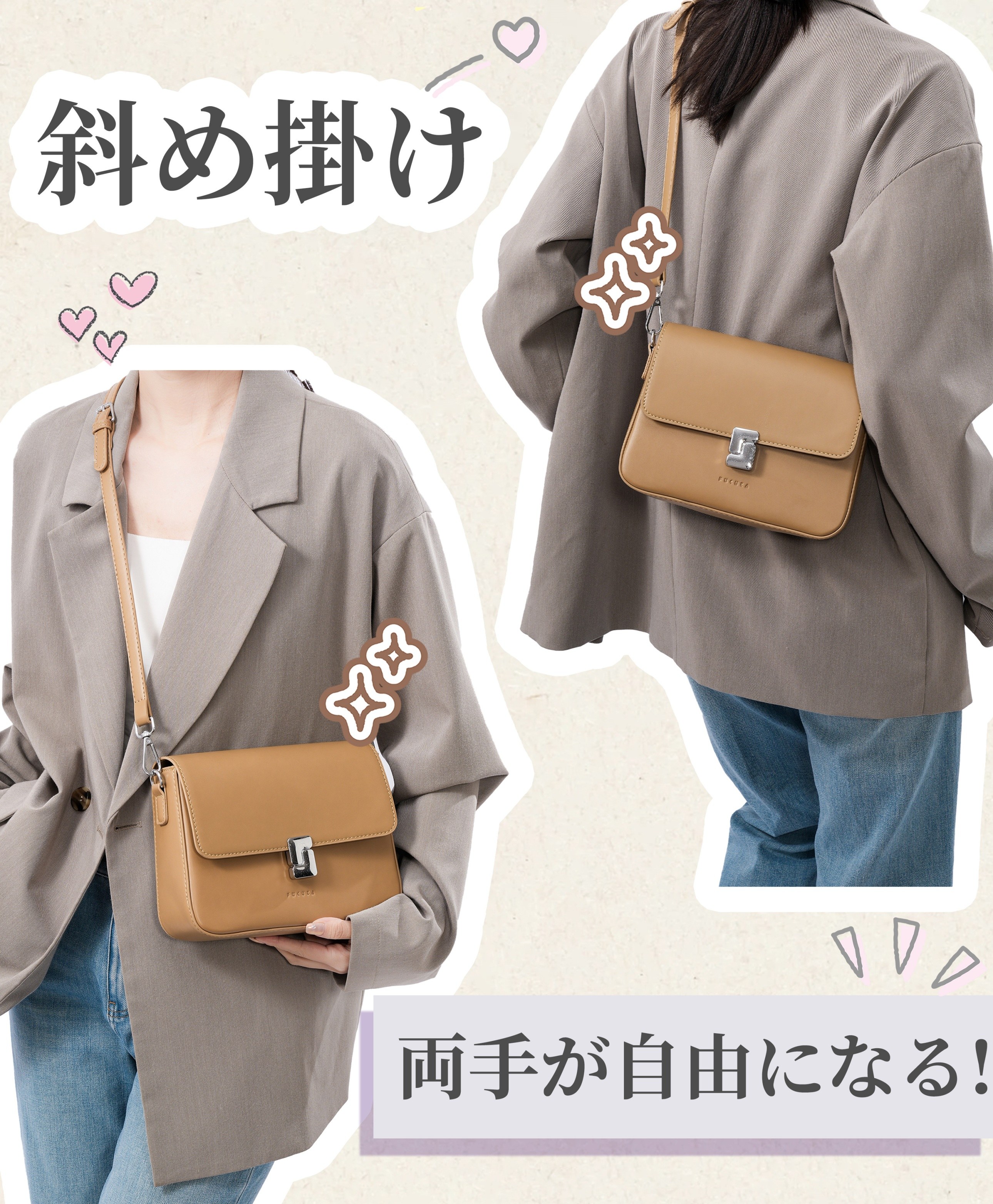 | ・斜め掛けも肩掛けもこれ一つでOK! ・シーンに合わせてスタイルチェンジが簡単に♪ |