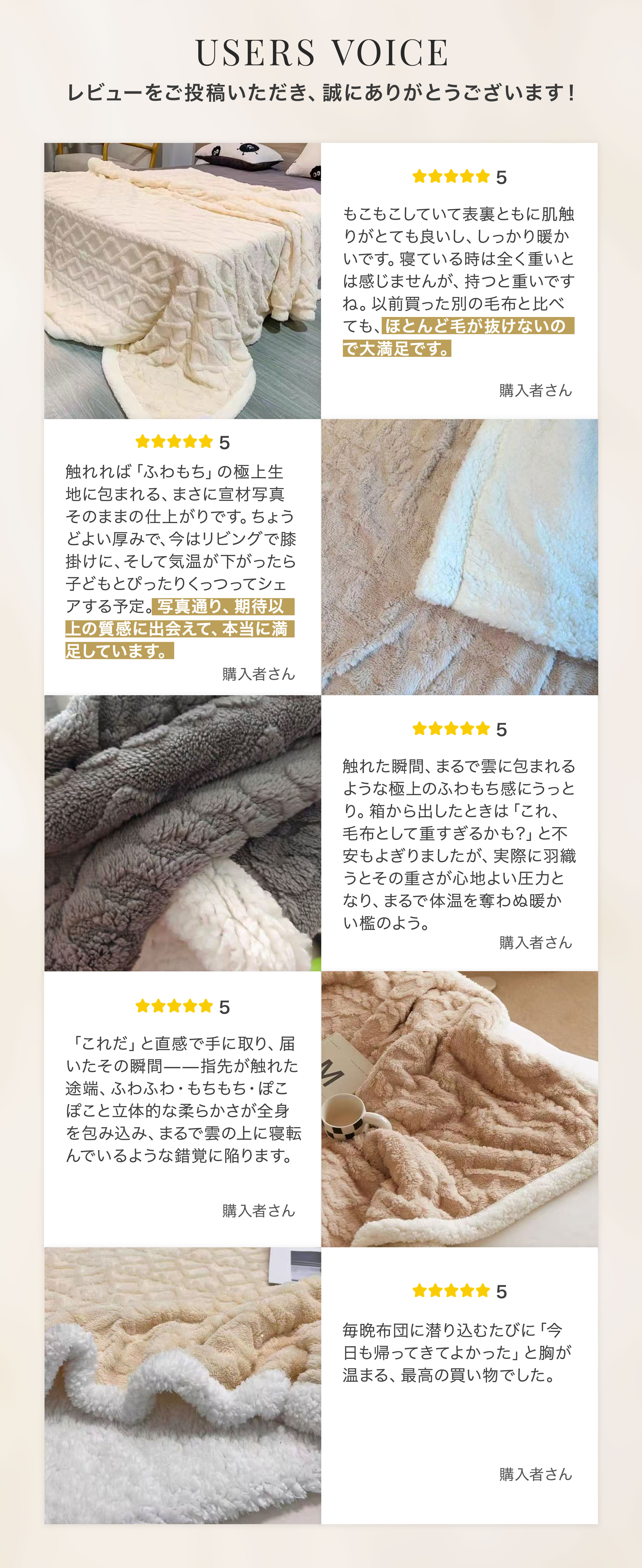 | 【とろける触感】うさぎのように柔らかい“ふわとろ”生地で全身をやさしく包み込みます。 【吸湿発熱×蓄熱】湿気を熱に変えてキープ。エアコン冷え対策にも活躍。 【軽量なのに暖か】肩も足元もぬくぬく、長時間の使用でも重さを感じにくい。 【洗える&抗菌防臭】ご家庭で丸洗いOK。毎日清潔に使えます。 【マルチに使える】ベッド・ソファ・車内・オフィス・お昼寝・ひざ掛けまで幅広く。シンプルでインテリアに馴染みます。 |