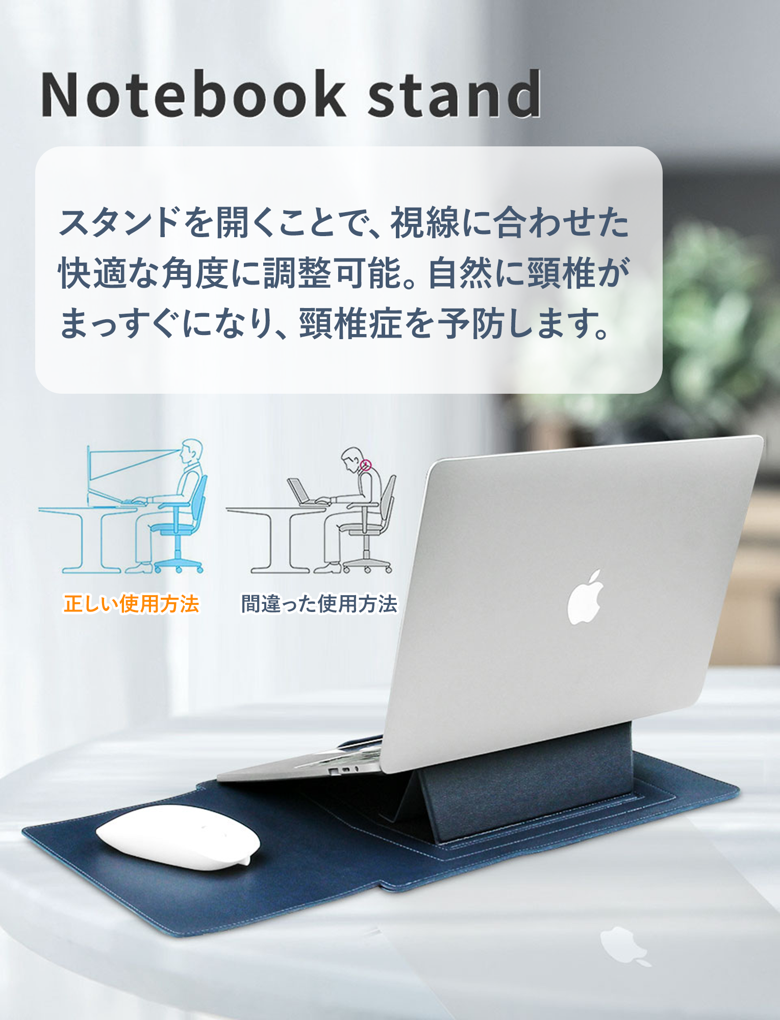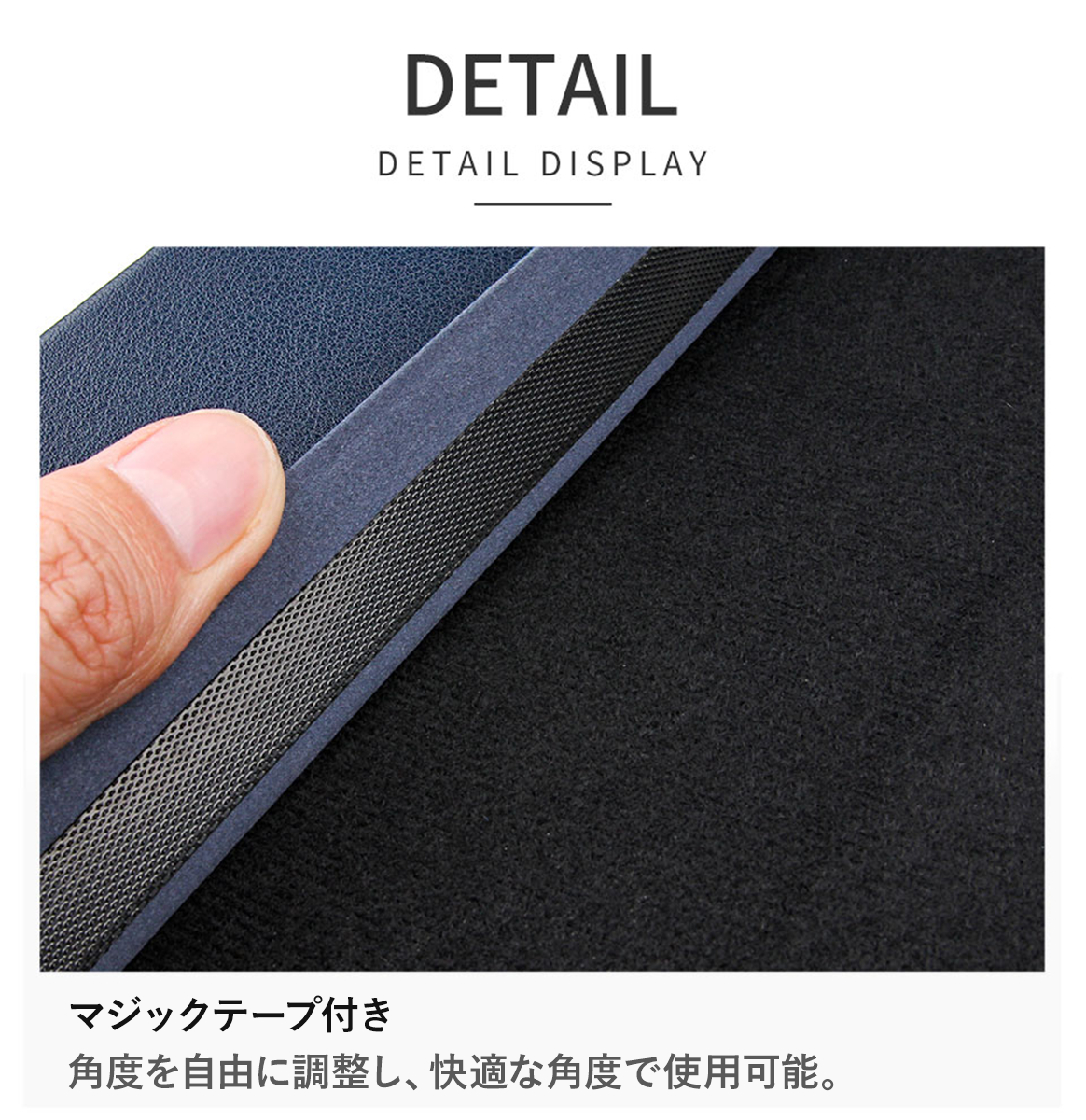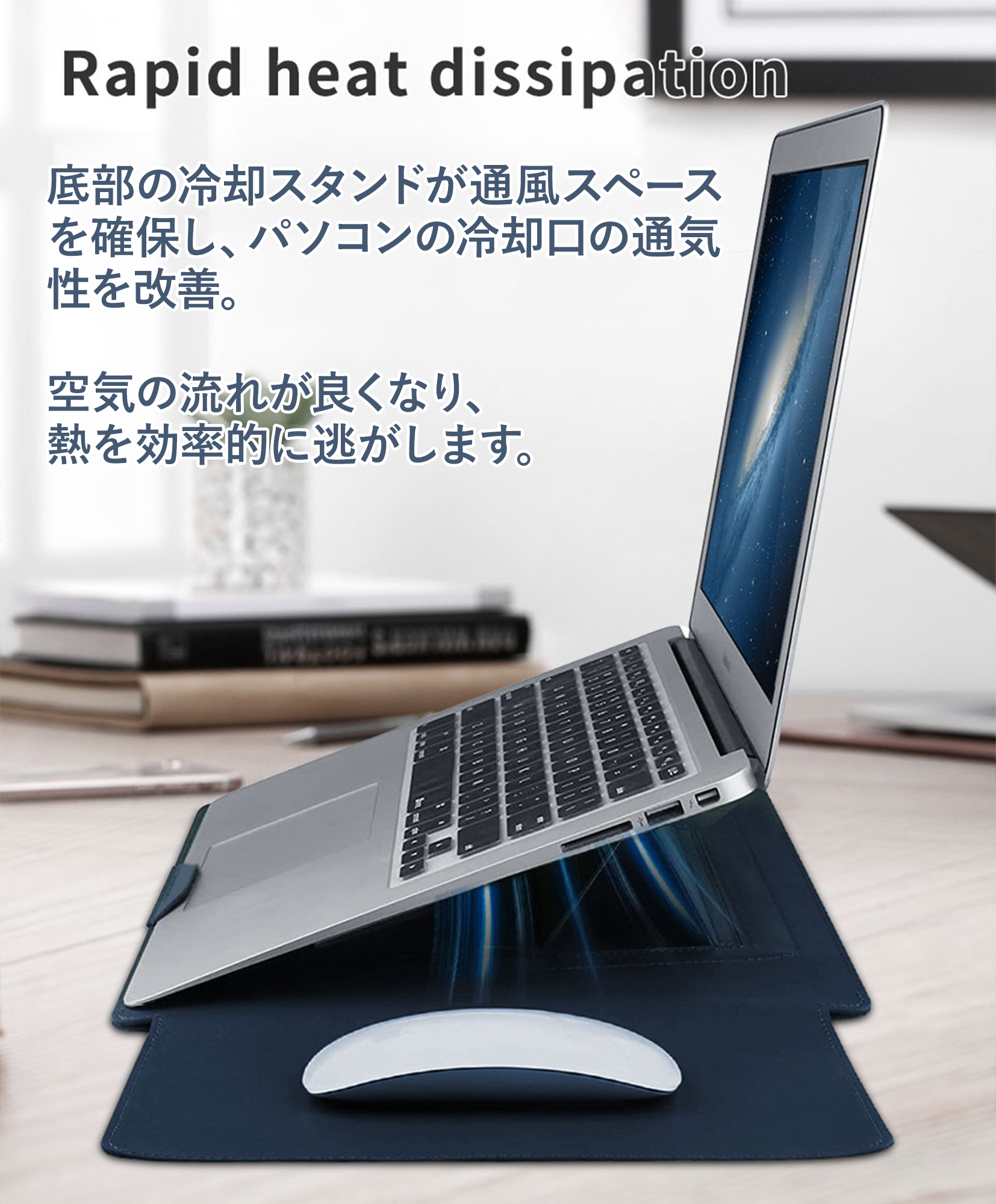 ・スタンド・マウスパッド・収納カバーの3in1機能:角度調整可能なスタンドとして使えるほか、前面をマウスパッドとして使用でき、内側には小物が収納可能。