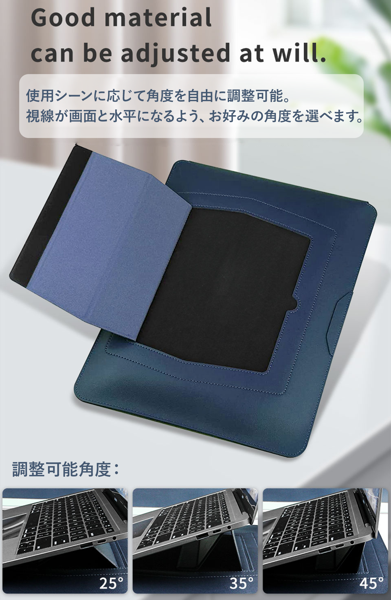 ・PC作業に適した角度調節:25°〜45°の範囲で目線と手元の高さを調整し、首や肩への負担を軽減。