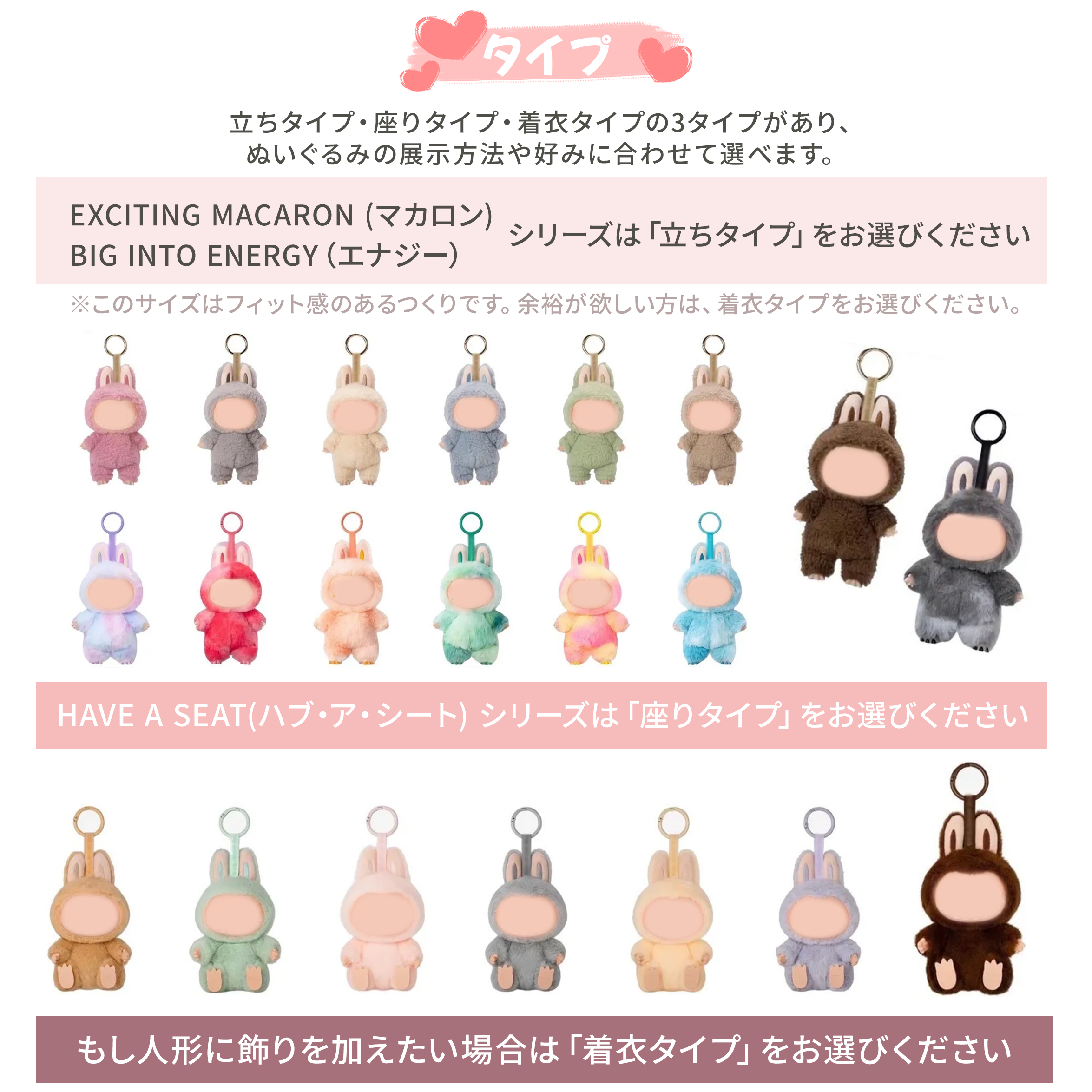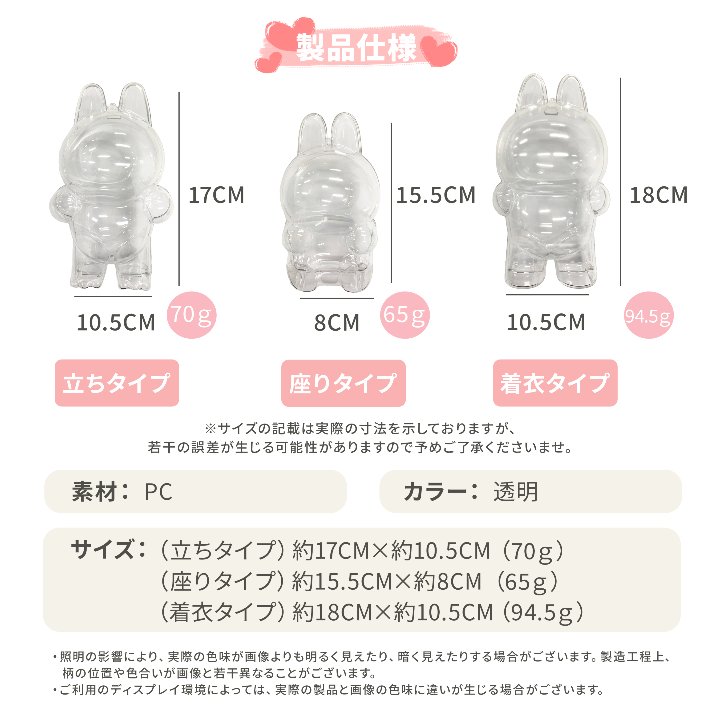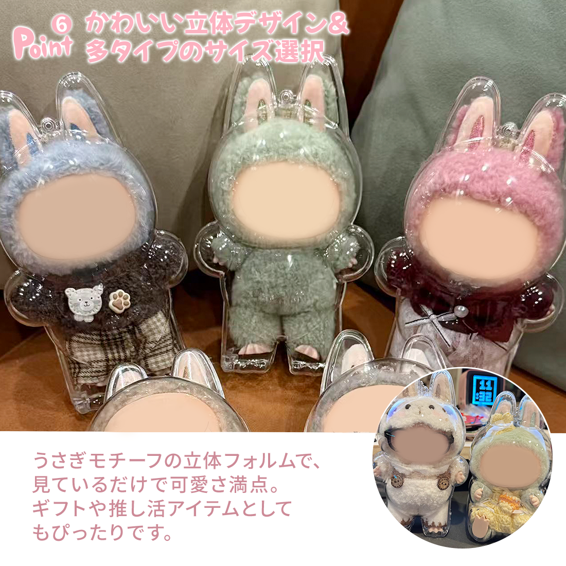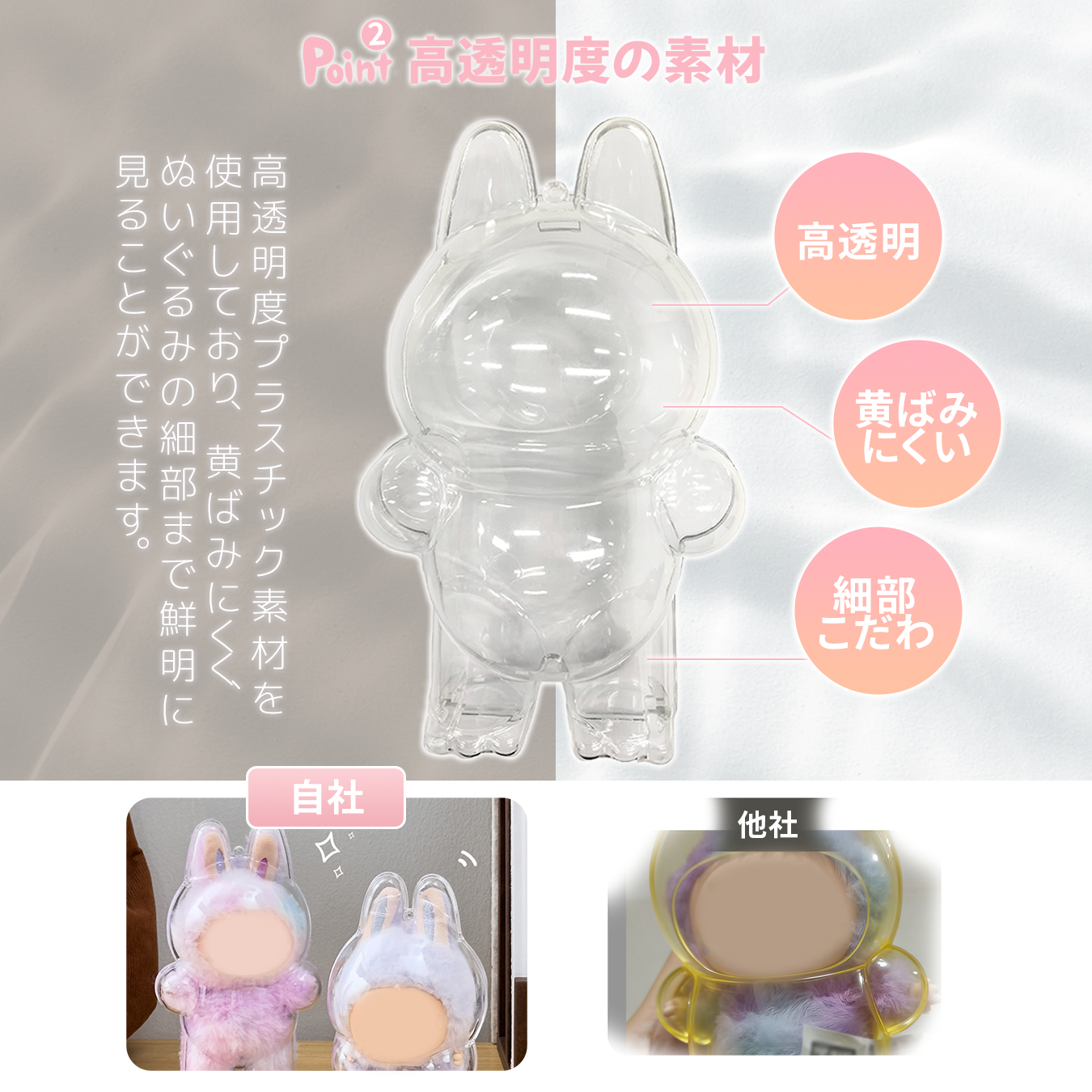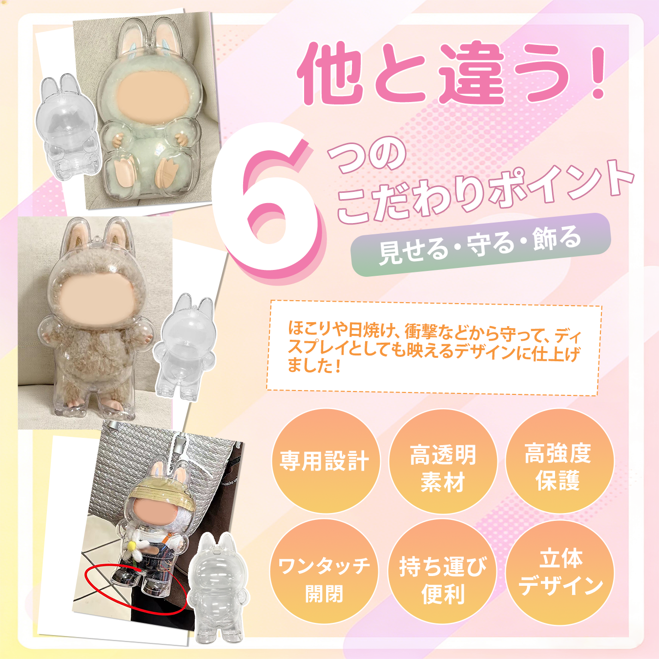 LABUBU ケース 保護ケース ぬいぐるみ 専用ケース 透明 クリア アクリル ポップマート POP MART プロテクター マカロン エナジー 立ち 座り 着衣 コーララブブ