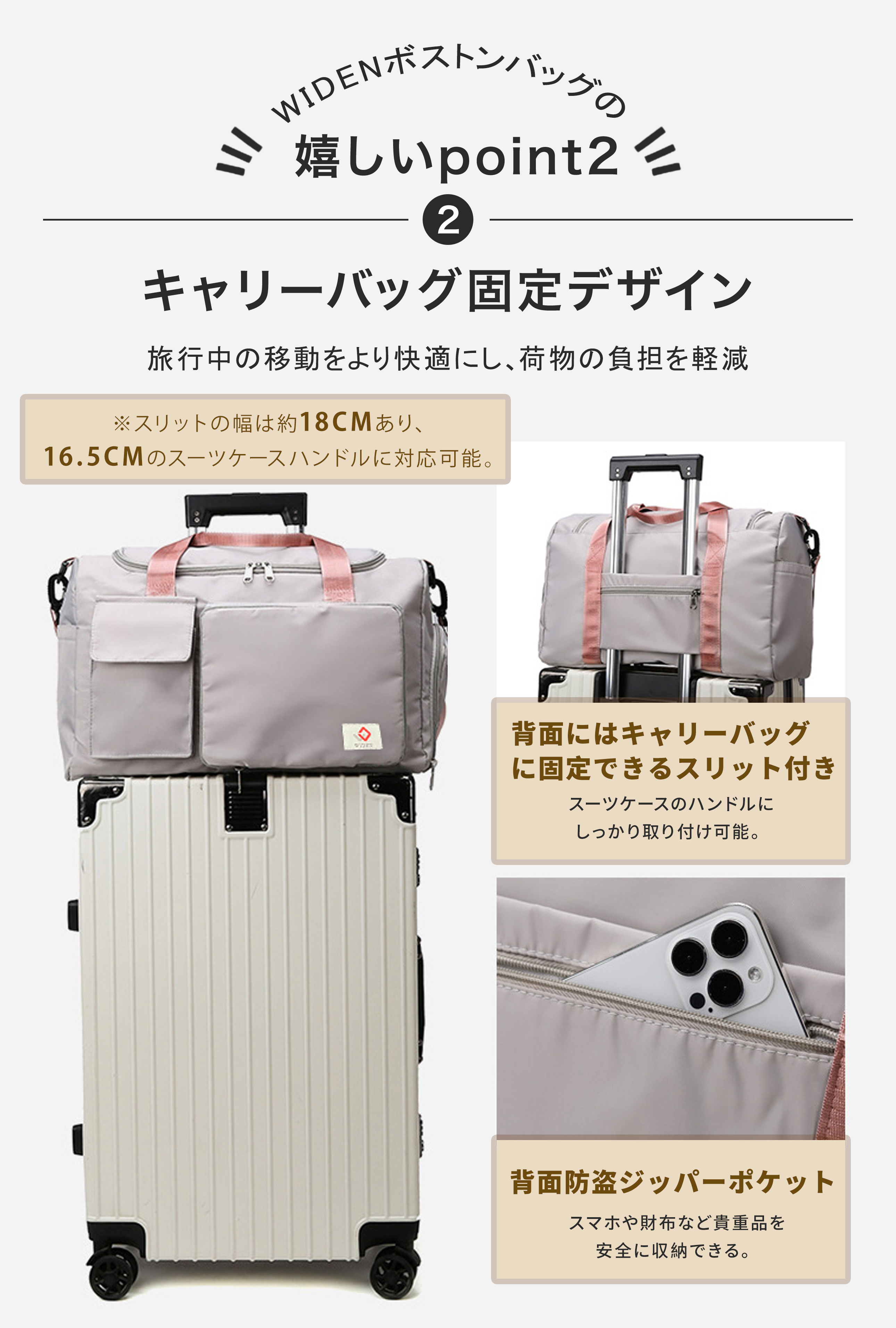 ●移動時もラクに連結可能:外側にスーツケースのハンドルを通せるスリット付き。空港や駅での移動時に重い荷物もまとめて楽々持ち運べます。