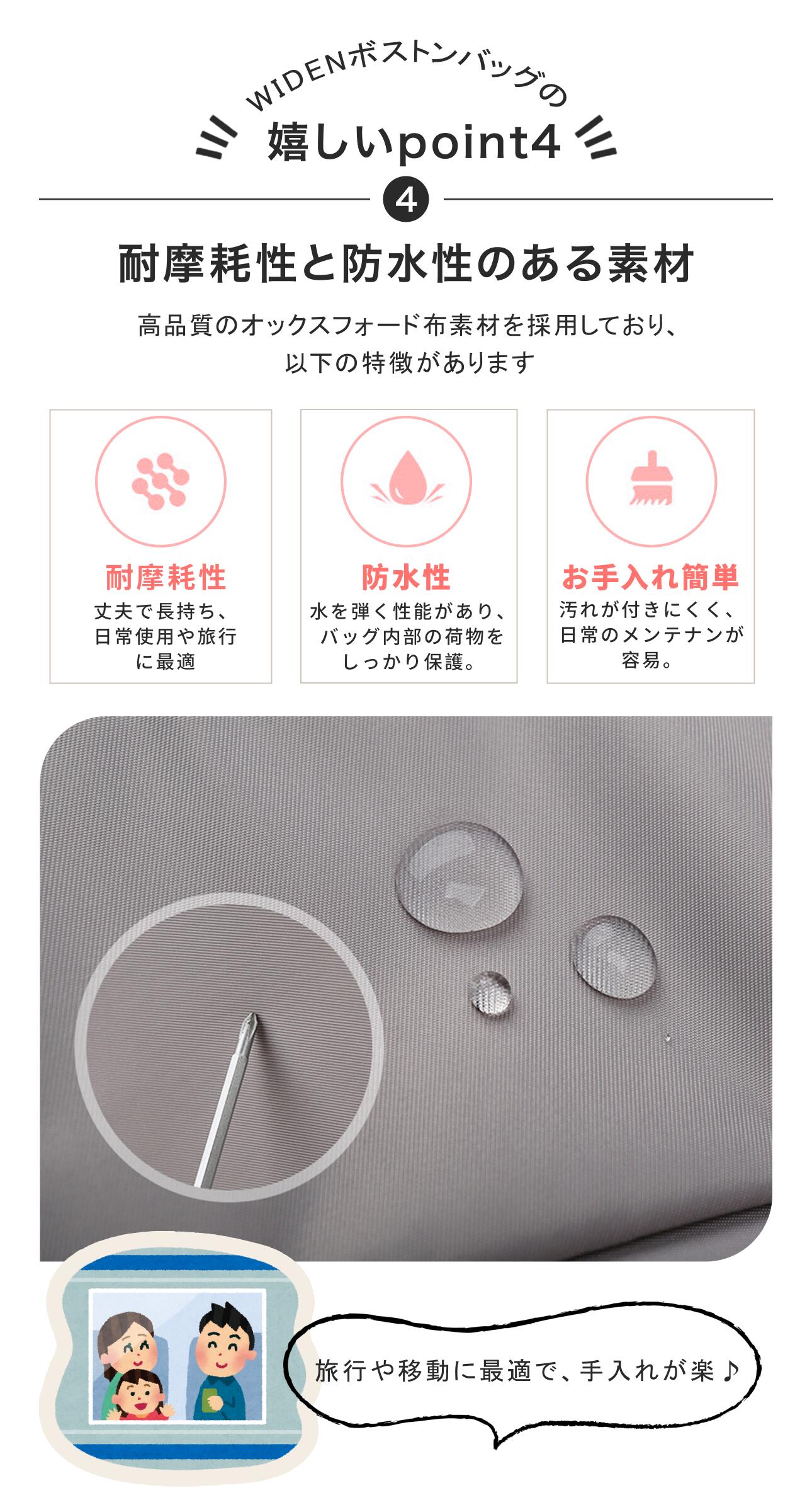 ●軽量・丈夫・撥水で日常使いにも安心:ナイロン素材を使用し、軽さと強度を両立。撥水加工が施されているため、急な雨にも安心して使用できます。