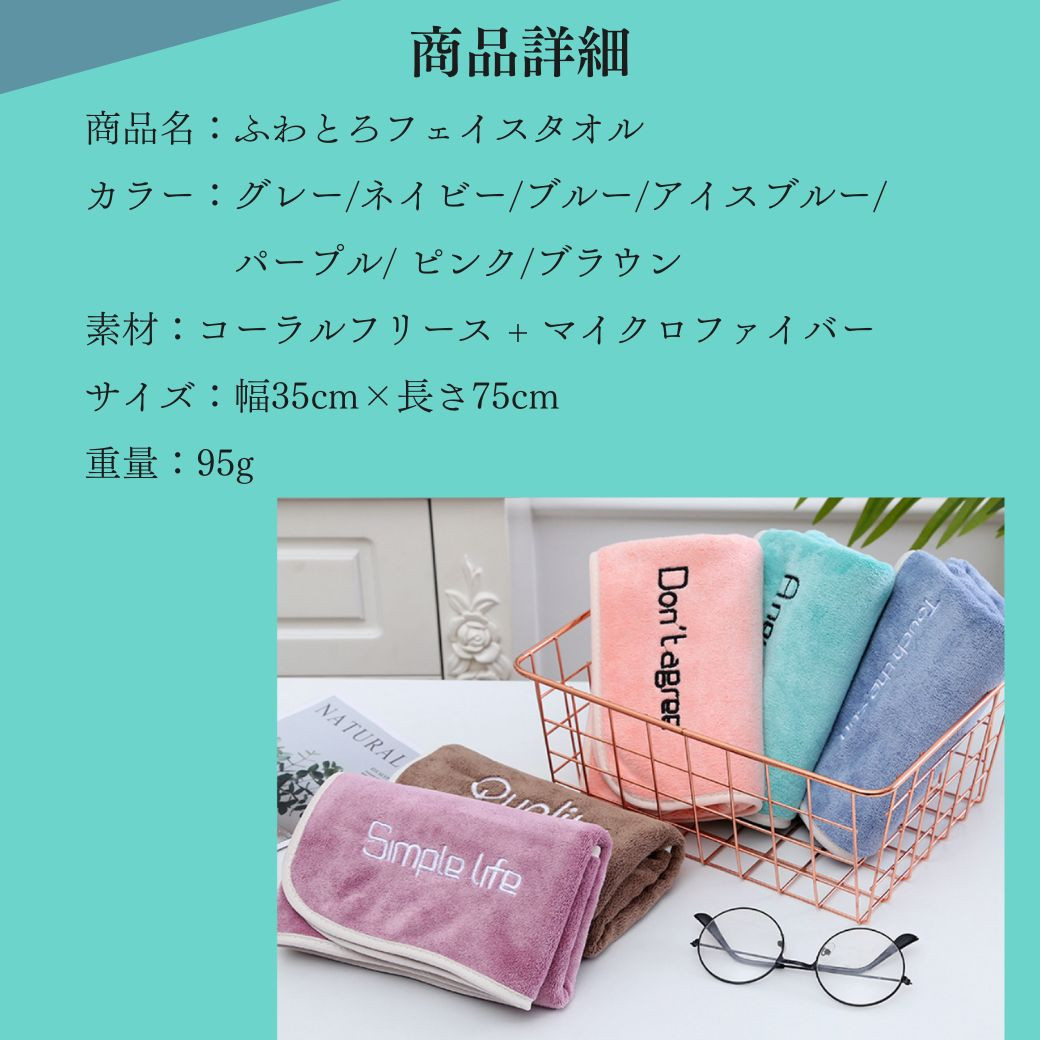 ・特徴:ギ厚手で速乾のマイクロファイバーを使用したフェイスタオル。コーラルフリースとマイクロファイバーを織り交ぜた生地を使用した柔らかくて、吸水性に優れたフェイスタオルです。ループ付きで、フックなどにかけて使用することができます。また、細かい繊維で毛羽落しにくい仕様になっているため、使いやすさも充分です。ワンポイントのロゴが北欧や韓国のインテリア雑貨を思い起こさせるおしゃれなデザインになっています。