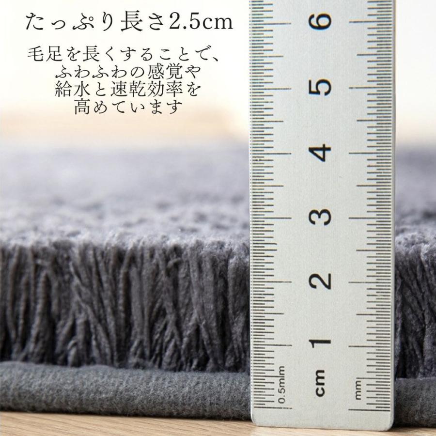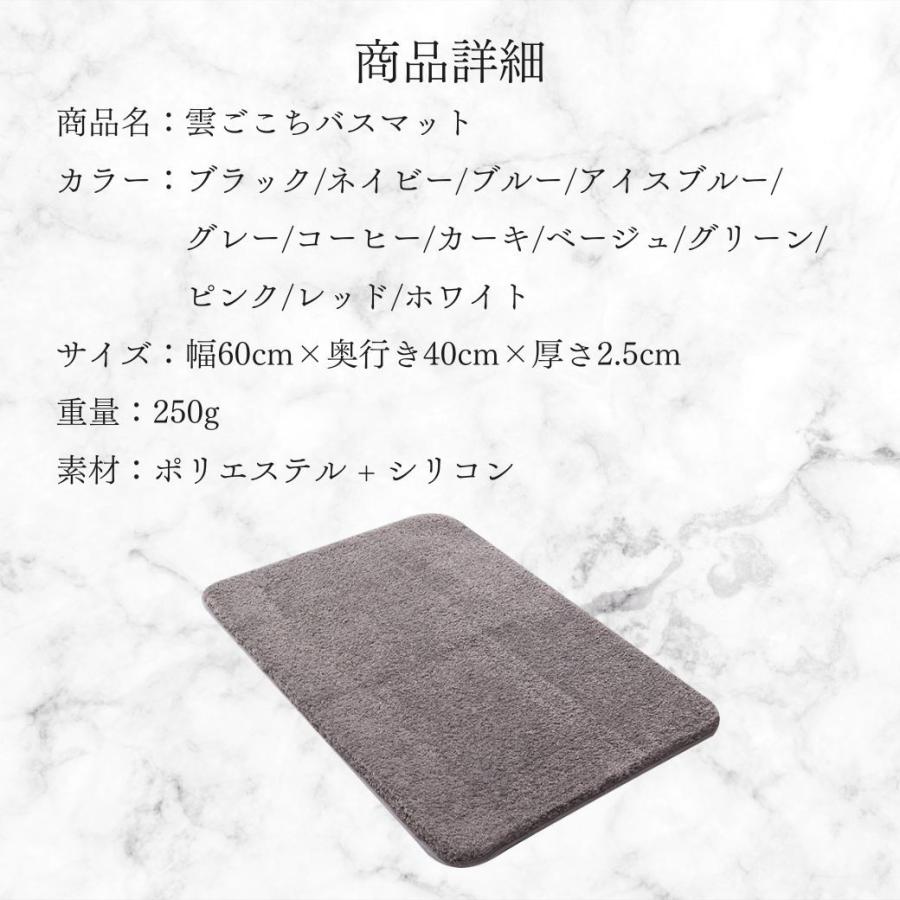 ・特徴:雲ごごちのふわふわバスマット。足全体もを優しく沈み込ませて吸水してくれるタオル地のバスマットです。おしゃれで気持ち良い使いごごちだけでなく、洗濯機で洗えるのでいつでも清潔に利用することができます。吸水性と速乾性にも優れており、珪藻土のバスマットとは違うサラッとした使い心地をお楽しみください。