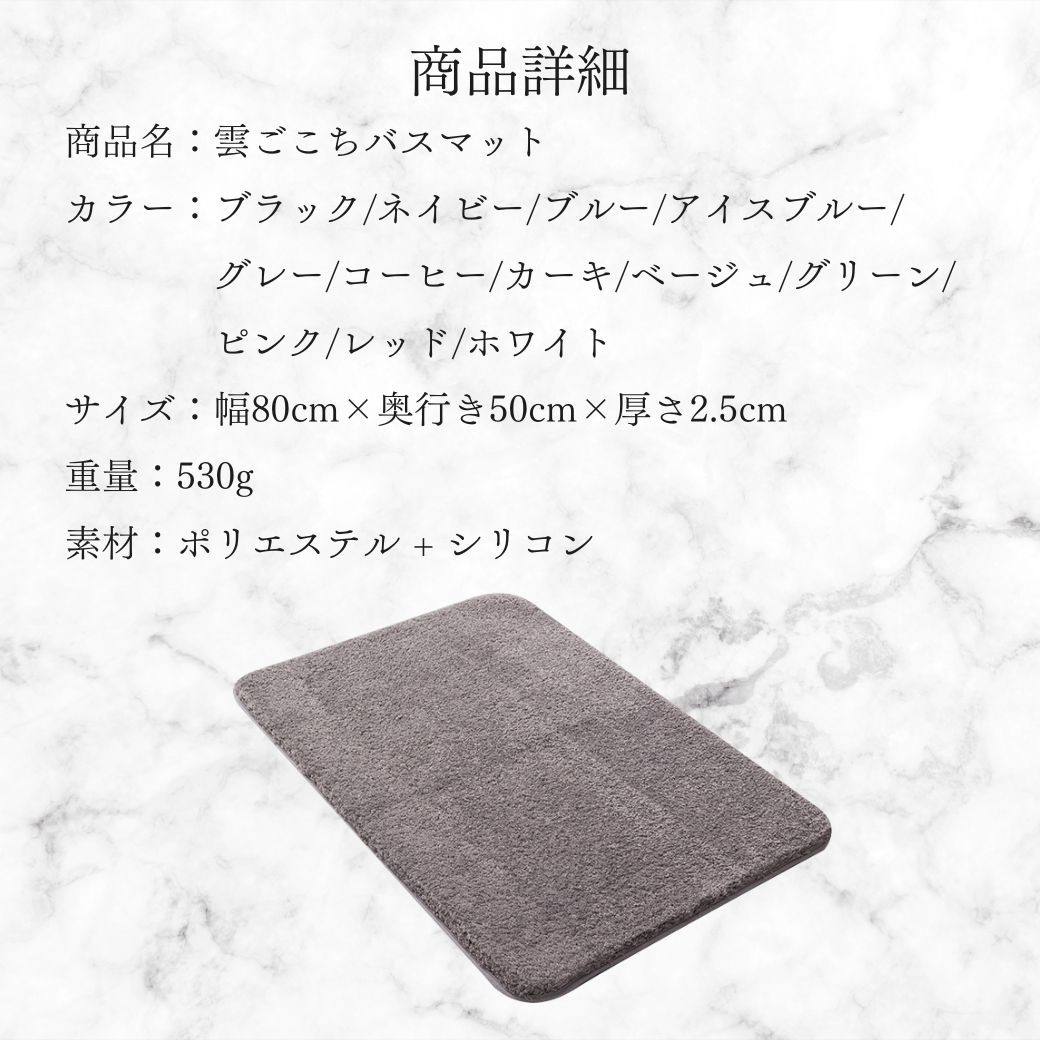 ・特徴:雲ごごちのふわふわバスマット。足全体もを優しく沈み込ませて吸水してくれるバスマットです。おしゃれで気持ち良い使いごごちだけでなく、洗濯機で洗えるのでいつでも清潔に利用することができます。吸水性と速乾性にも優れており、サラッとした使い心地をお楽しみください。