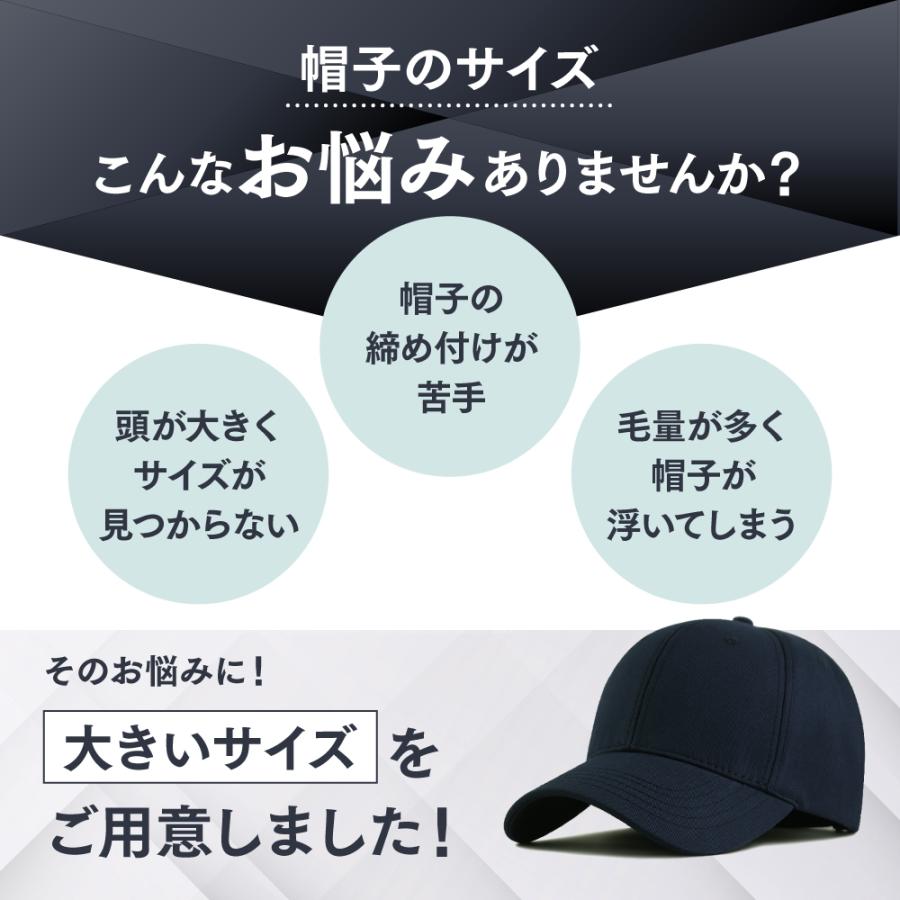 特徴:頭が大きい、締め付けが苦手。帽子のサイズのお悩みに。大きい!深めに被れる!「ビッグサイズキャップ」が登場!どんなスタイルにも合わせやすく、普段着からアウトドアシーンまで幅広く使える!こだわりのディティールで丁寧な縫製としっかりとした生地!バックベルトでサイズ調整が可能です。立体的なシルエットはしっかりとした硬めの生地がキャップの形をキープします。立体的なシルエットで小顔効果も!