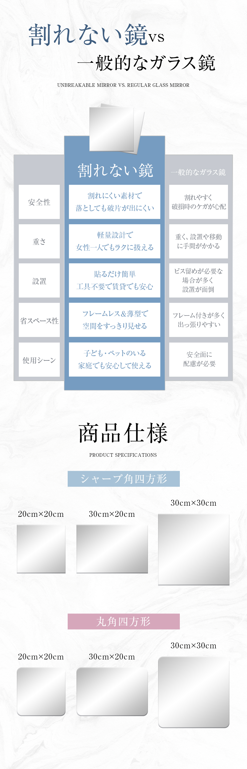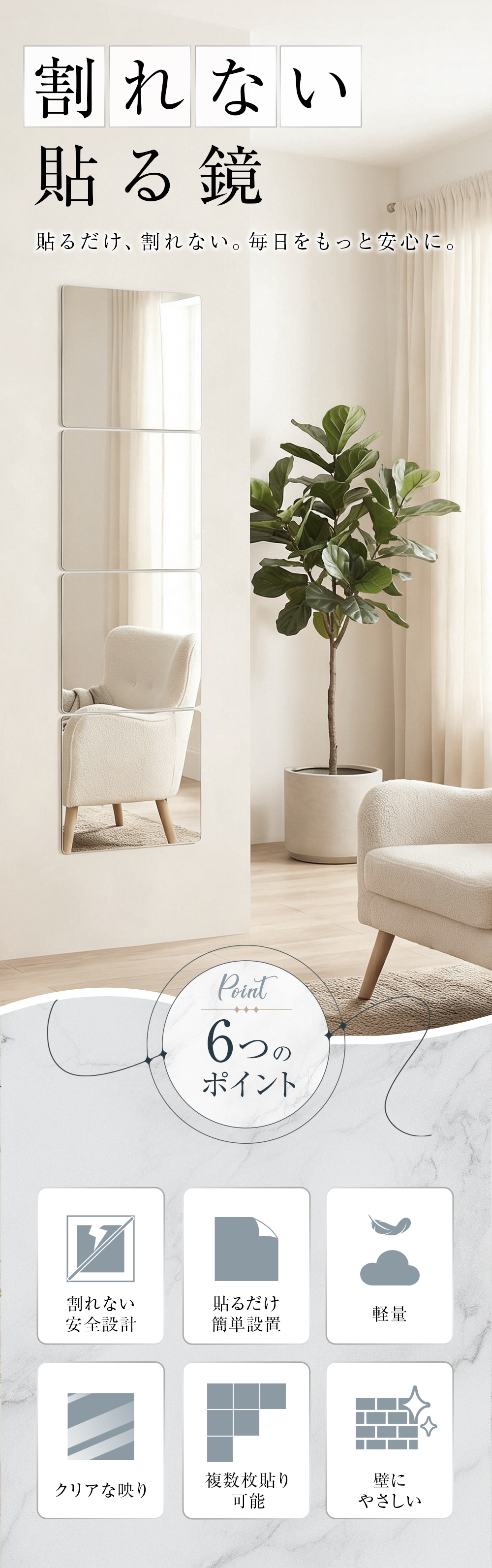 割れにくい素材を採用した、貼るだけで設置できる軽量ミラーです。