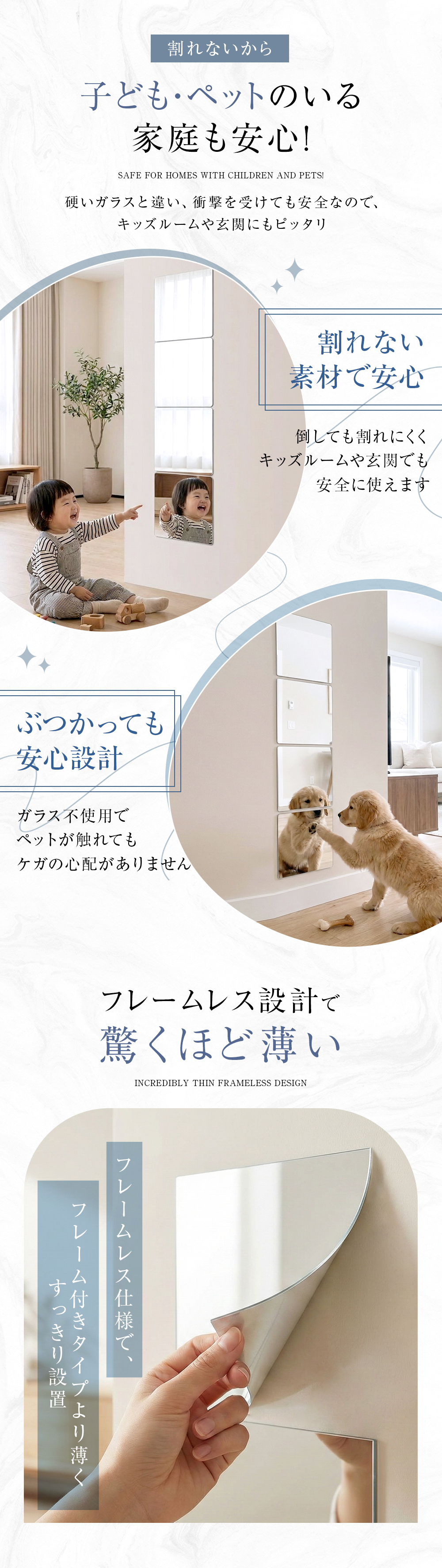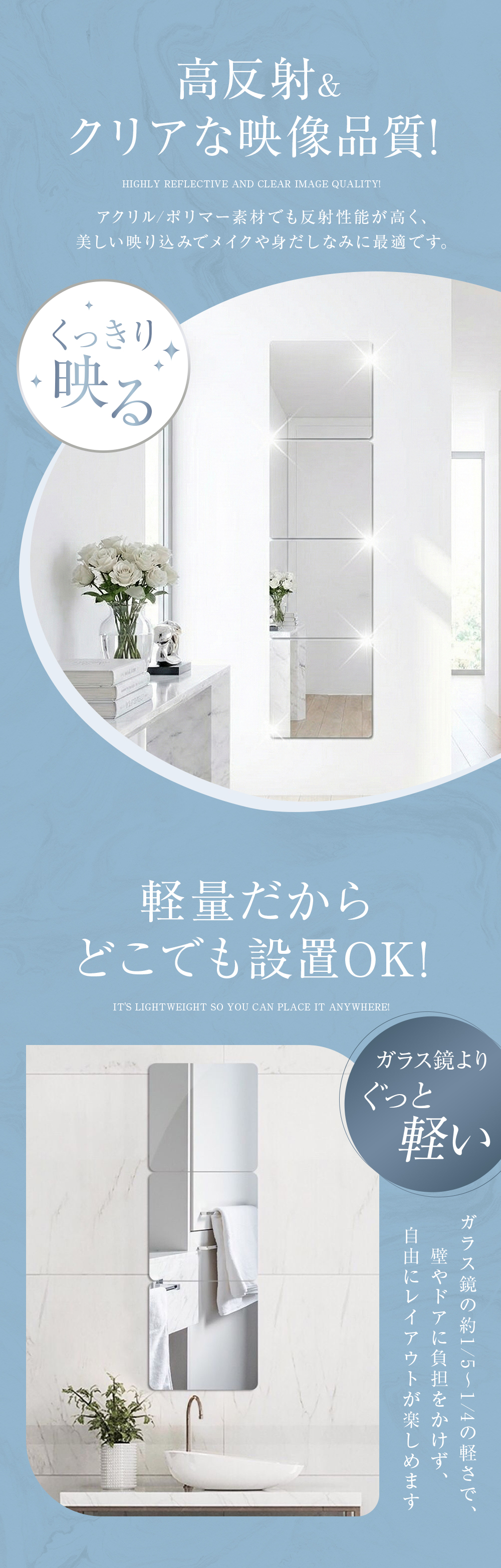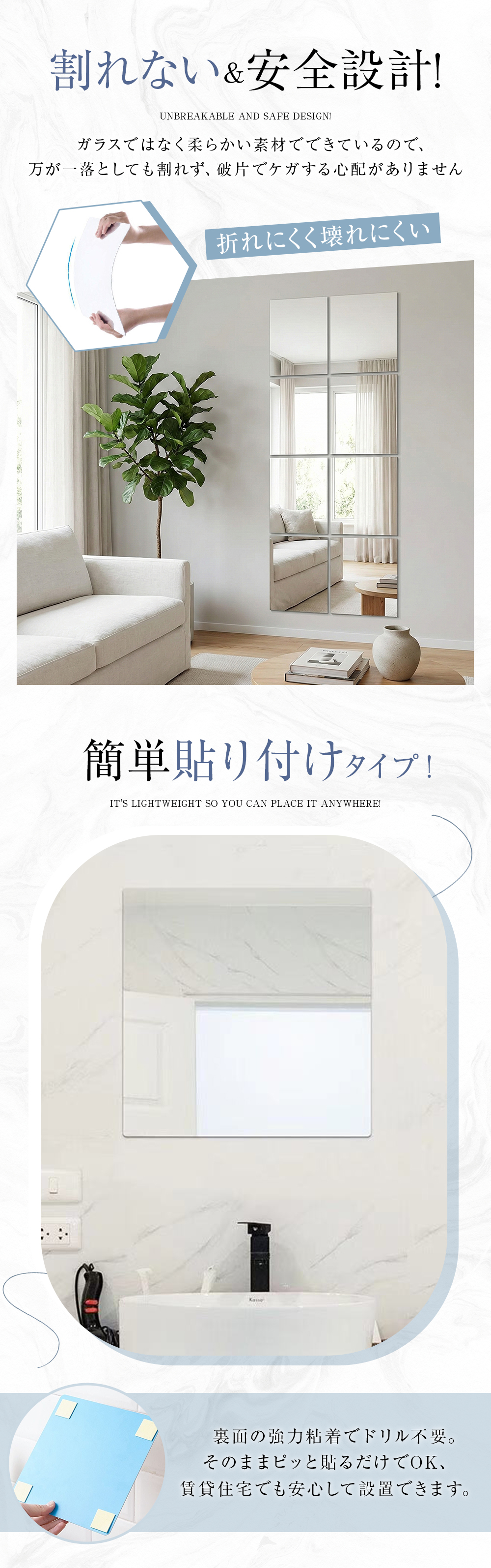 【6枚以上で1枚おまけ】 割れない鏡 貼るだけ ミラー 2枚/4枚/6枚 アクリルミラー 軽量 フィルムミラー 壁掛け フレームレス 安全 子ども ペット 賃貸住宅にOK