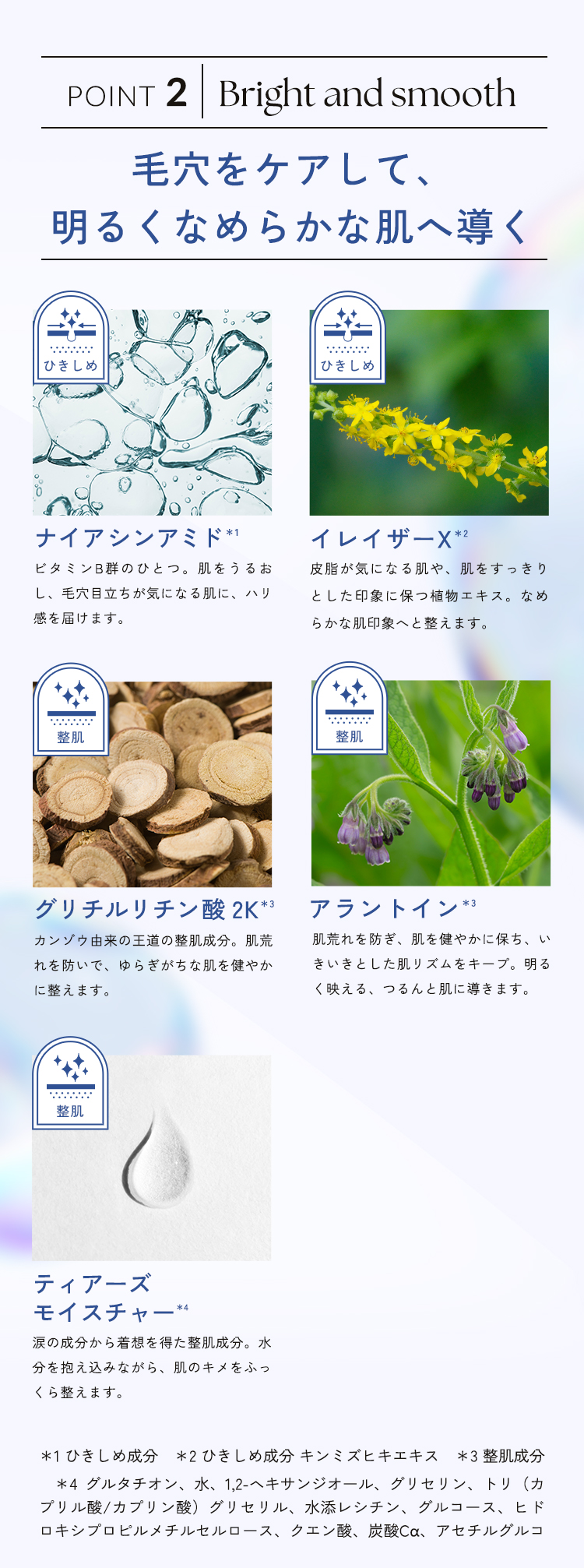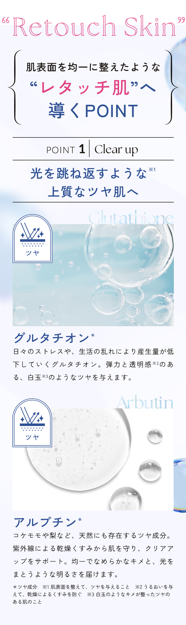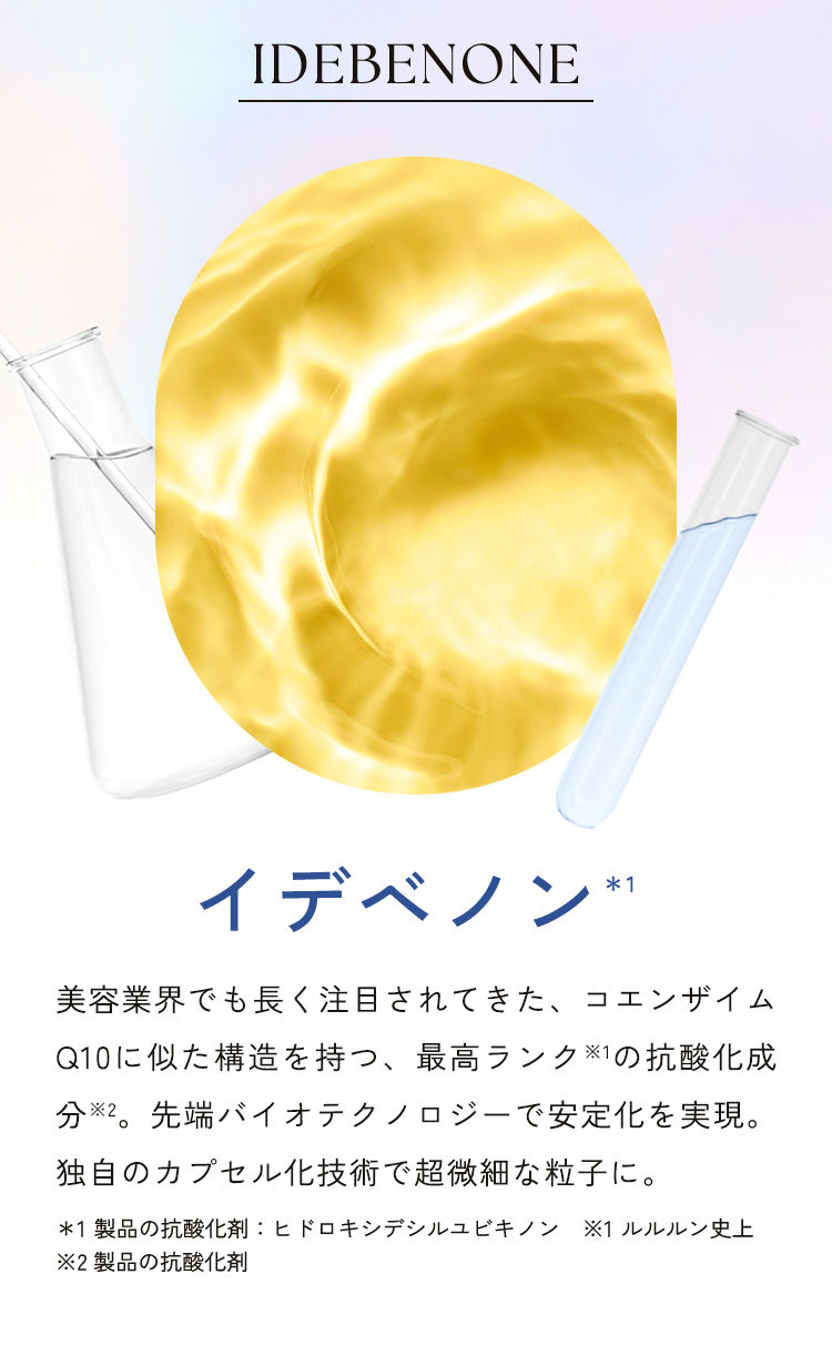 全成分 :水、グリセリン、BG、グリセレス-26、ヒドロキシデシルユビキノン、キンミズヒキエキス、グルタチオン、アルブチン、ナイアシンアミド、グリチルリチン酸2K、アラントイン、アスコルビン酸、PEG/PPG/ポリブチレングリコール−8/5/3グリセリン、ベタイン、カンジダボンビコラ/(グルコース/ナタネ油脂肪酸メチル)発酵物、DPG、エトキシジグリコール、ヒマワリ種子油、アルギニン、アセチルグルコサミン、加水分解ホホバエステル、1,2-ヘキサンジオール、トリ(カプリル酸/カプリン酸)グリセリル、水添レシチン、グルコース、ヒドロキシプロピルメチルセルロース、クエン酸、炭酸Ca、(アクリル酸グリセリル/アクリル酸)コポリマー、(メチルビニルエーテル/マレイン酸)コポリマー、デキストリン、キサンタンガム、異性化糖、クエン酸Na、PEG-75、EDTA-2Na、PEG-40水添ヒマシ油、フェノキシエタノール、メチルパラベン