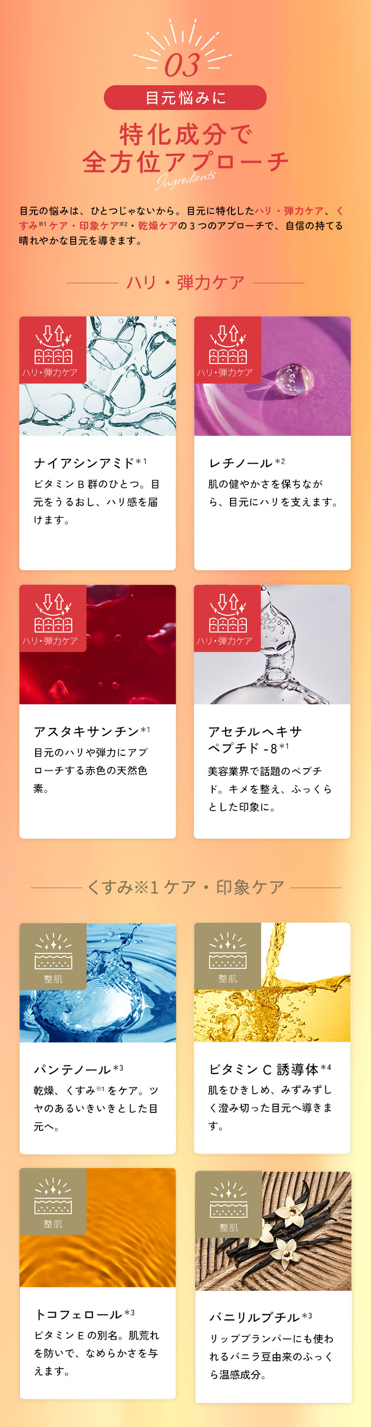 全成分: スクワラン、水添(スチレン/ブタジエン)コポリマー、オリーブ果実油、水添ポリ(C6-14オレフィン)、(スチレン/イソプレン)コポリマー、テトラヘキシルデカン酸アスコルビル、トコフェロール、パルミチン酸レチノール、パンテノール、ナイアシンアミド、セラミドNP、アセチルヘキサペプチド-8、シアノコバラミン、ヒアルロン酸Na、加水分解コラーゲン、ヘマトコッカスプルビアリスエキス、アスタキサンチン、βーカロチン、バニリルブチル、ラウリン酸ポリグリセリル-3、エチルヘキサン酸セチル、セスキステアリン酸メチルグルコース、コーン油、トリ(カプリル酸/カプリン酸)グリセリル