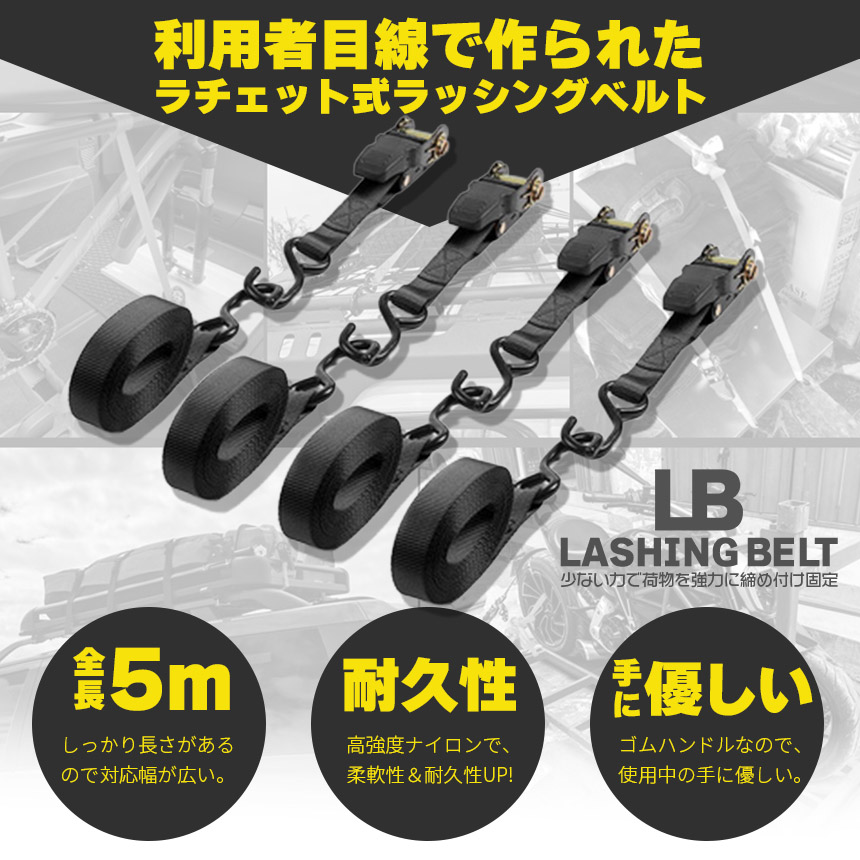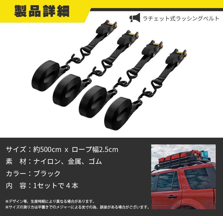 ラチェットベルト ラッシングベルト ラチェット式ラッシングベルト 4本セット 荷締めベルト 固定ベルト運搬ベルト 5m×2.5cm 強力フック付き アウトドア 引っ越し 車載 アウトドア キャンプ 運搬 運ぶ ルーフキャ