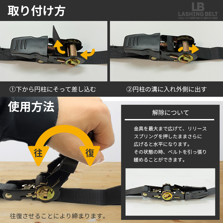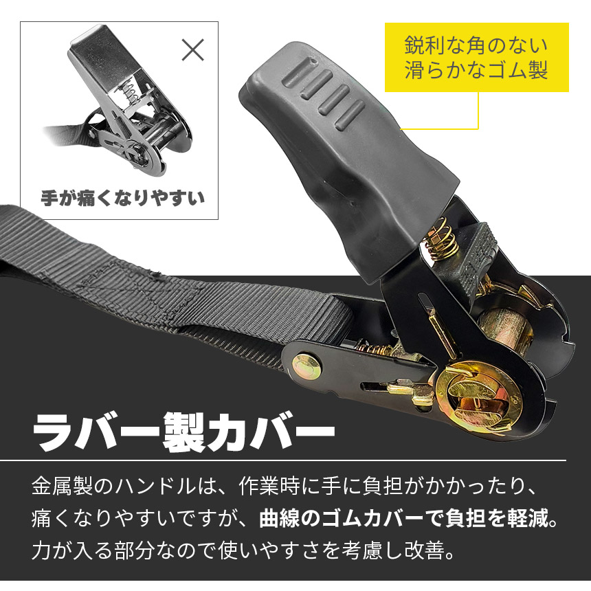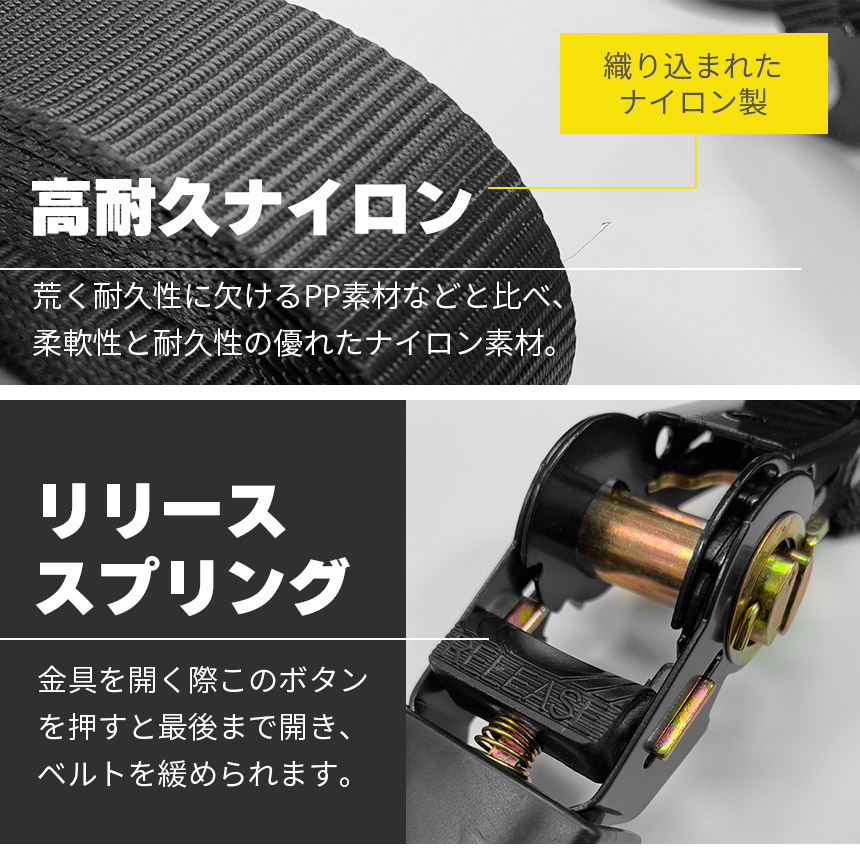 ラチェット式を採用した荷締めベルト。少ない力でしっかりテンションをかけられるので、走行中の荷物のズレや落下を防止します。