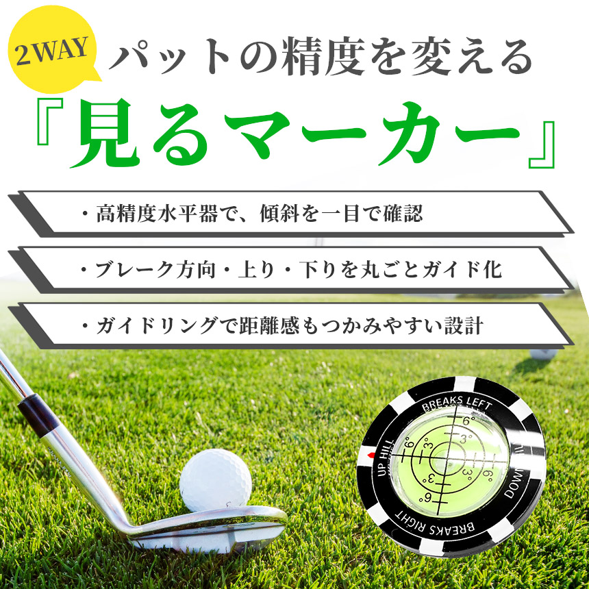この 水平器付きゴルフマーカー は、置くだけでグリーンの傾斜を視覚化。