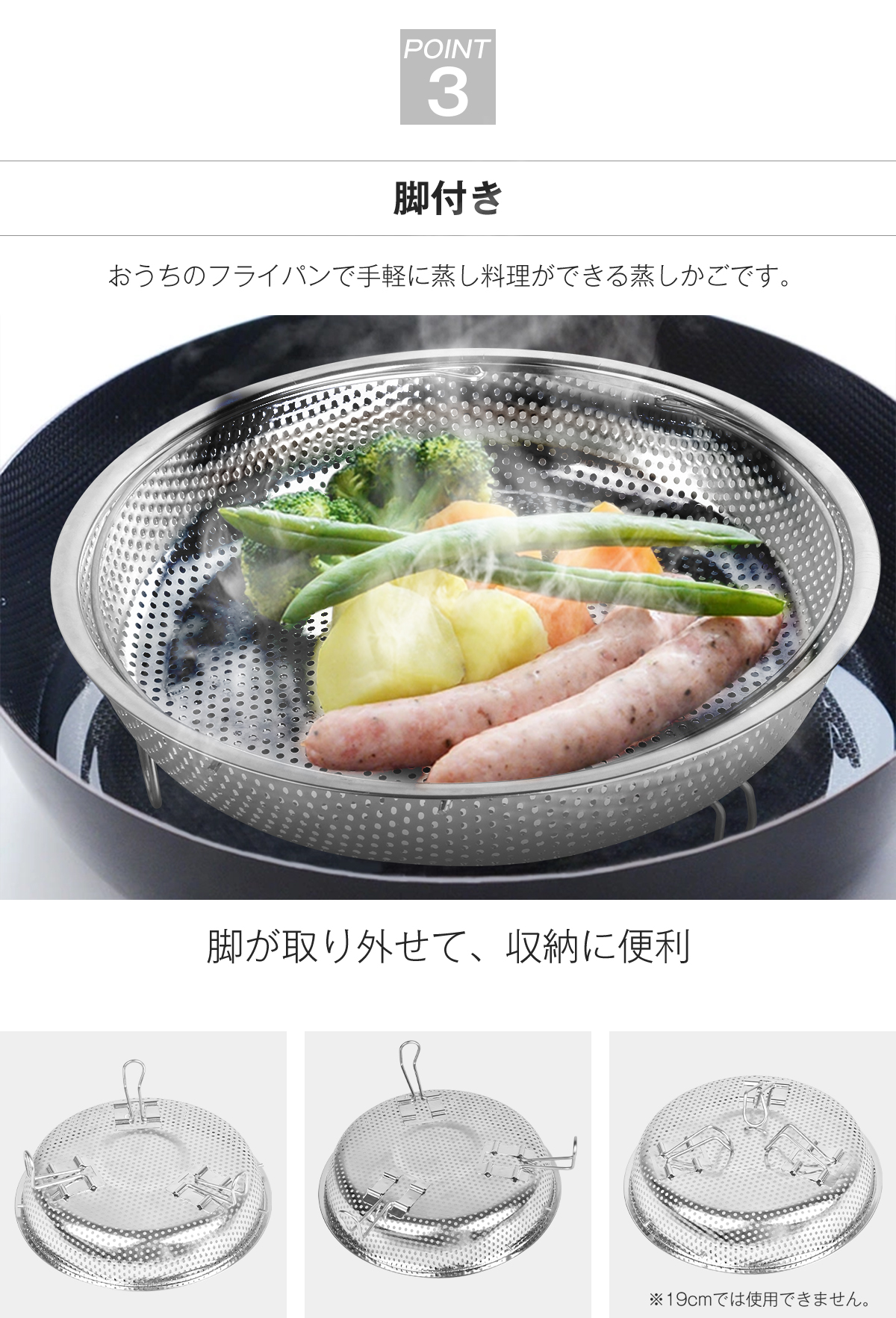 脚付きデザイン: フライパンやお鍋に安定して乗せられ、食材が直接水に触れないため、均一に蒸し上がります。脚は取り外し可能で、収納時にかさばりません(※19cmサイズは脚付きデザインに対応していないため、ご注意ください)。