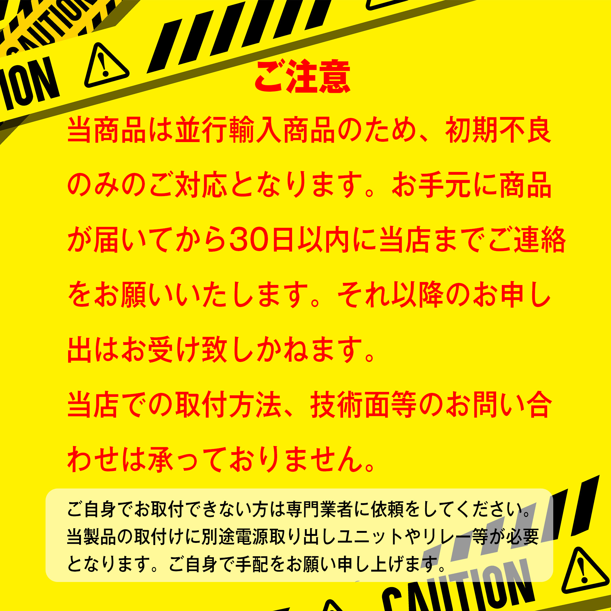 | 取付けについて | 本製品の取付けは必ず専門業者にご依頼ください。誤ったご使用方法、取付方法による故障、破損、事故等に関する責任を当店が負うことはありません。 自己責任でお願いいたします。 |