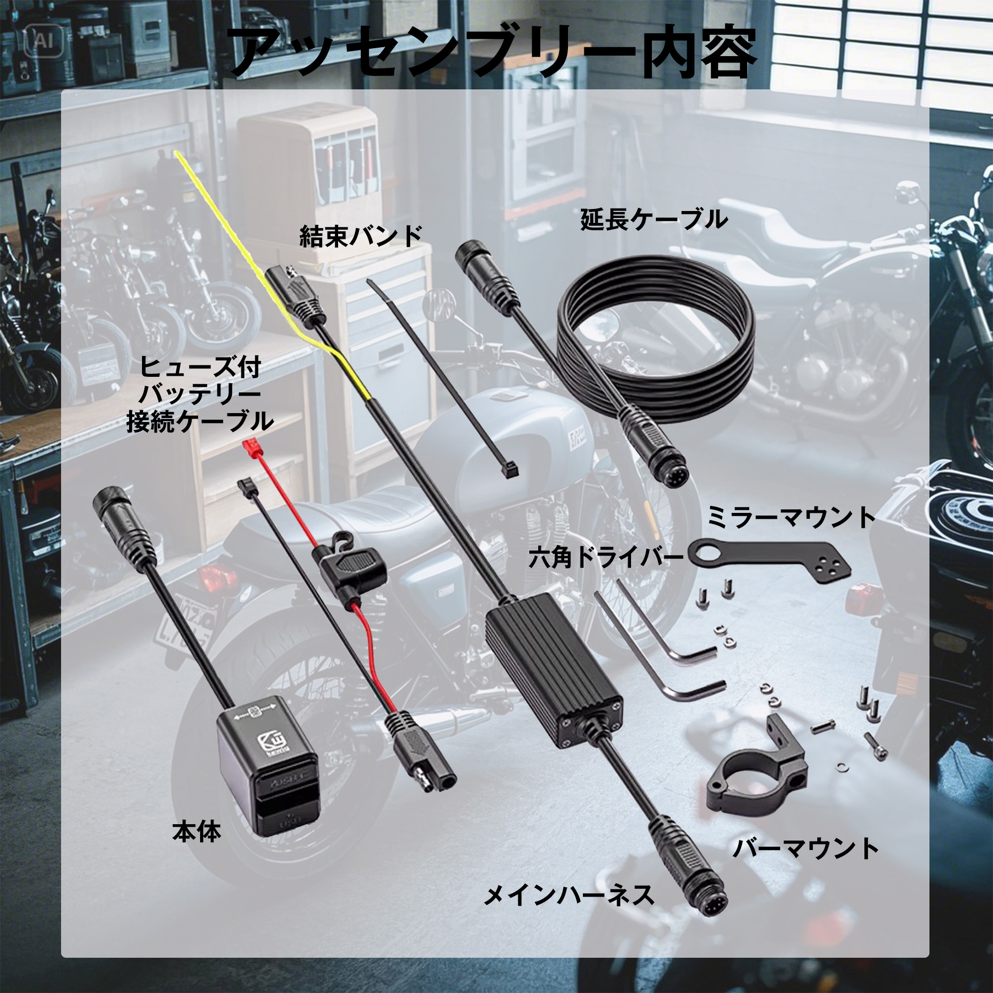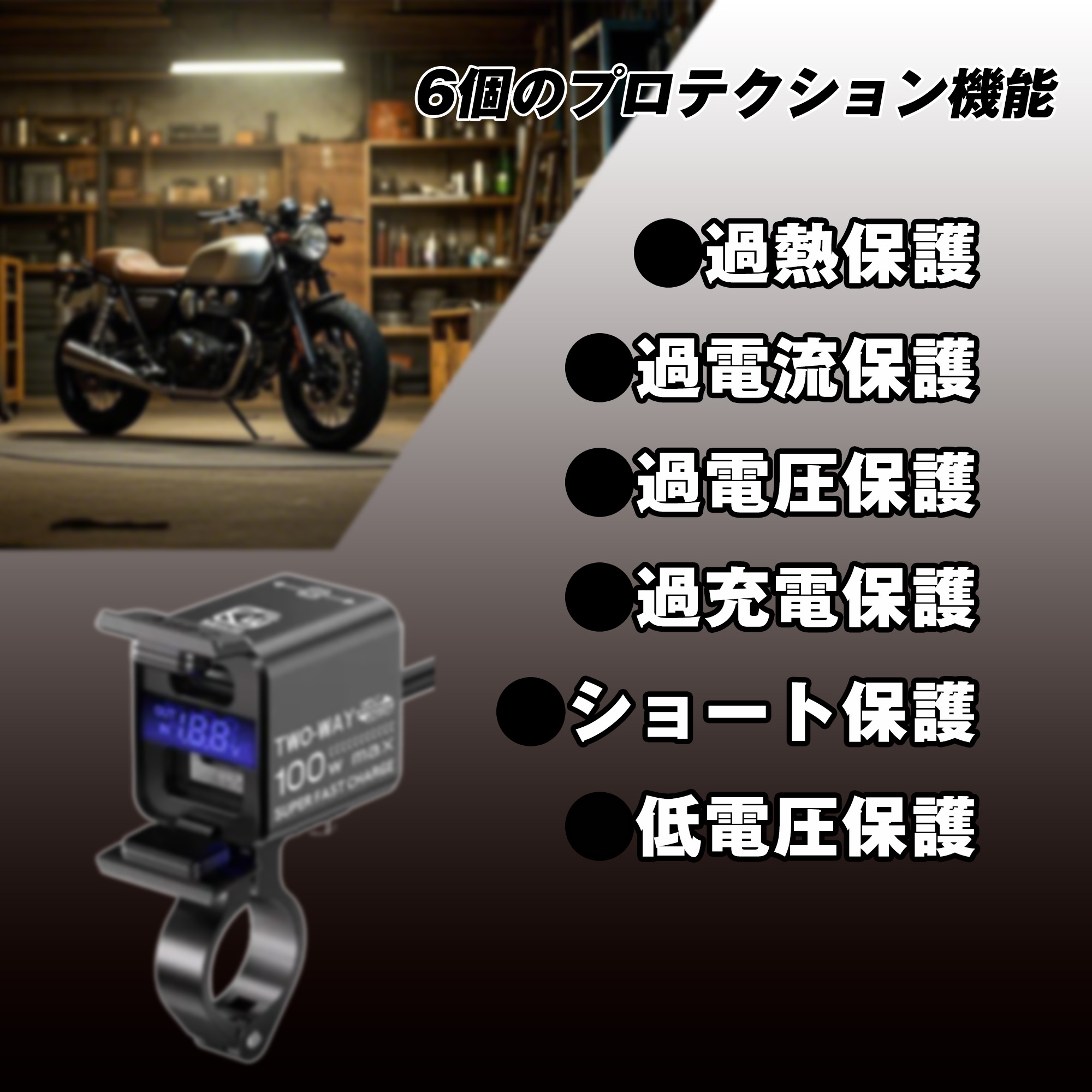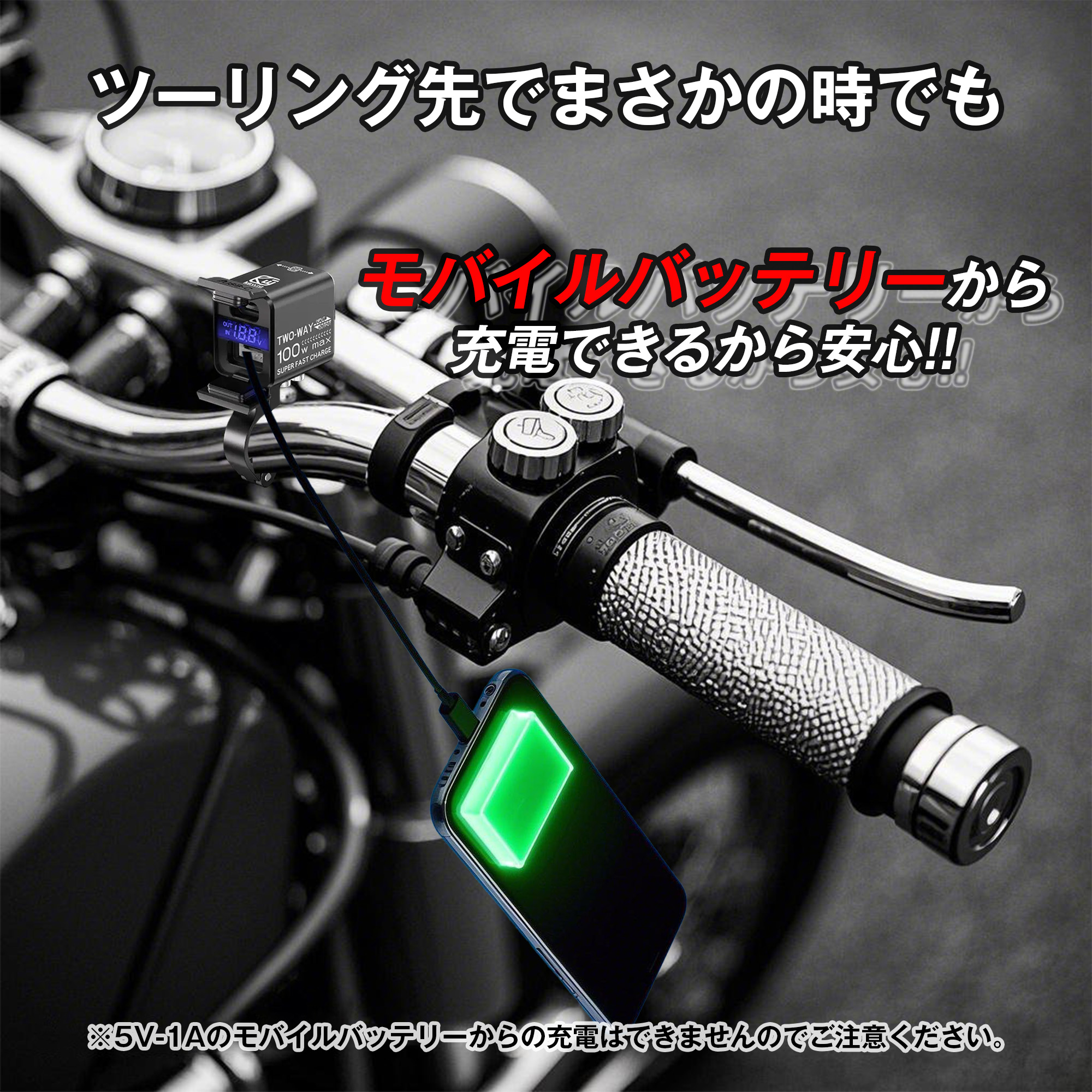 | ご使用方法・注意点 | 1.本製品は、USB-AとUSB-Cのデュアルポートを備えた「バイク用双方向100W急速充電器」です。 2. この製品は、12V 鉛蓄電池(メンテナンスフリーバッテリー、AGM バッテリーを含む)および 12V リン酸鉄バッテリーに適しています。バッテリーを使用目的以外の事に使用しないでください。 3.本製品のバッテリー端子は12〜14.BVの電圧に接続されています。16.BVを超えるとデバイスは動作しません。25Vを超えると、製品が発火するおそれがありますので絶対に使用しないでください。 4 この製品をバイクに取り付ける場合は、赤線をバッテリーのプラス極に、黒線をバッテリーのマイナス極に、黄線をACC(バイクのキーで車両全体の電源を遮断できる位置)に接続する必要があります。プラスとマイナスを逆に接続しないでください。逆に接続するとケーブルのヒューズが切れます。ヒューズが切れた場合は、ケーブルのヒューズボックス内のヒューズを交換してください。 5.本製品の電源モジュールを取り付ける際は、エンジンなどの熱源から離して設置してください。 6 本製品を取り付ける際は、ケーブルの防水コネクタをしっかり接続してください。電源を入れたままコネクタを抜き差しすると製品破損することがありますので注意してください。 7. 製品が入力または出力しているときにケーブルコネクタを抜き差ししないでください。破損することがあります。 8モバイル機器等を充電する場合は、バイクのバッテリーが低下しないように、バイクのエンジンを始動した状態で行ってください。エンジンを始動しない場合はバッテリーが低下し、エンジン始動できなくなることがあります。 9.本製品の防塵・防水レベルはIP66です。車を洗うときは、水が入らないように防水カバーをかけてください。 10.許可なく装置を分解、改造、修理しないでください。 |