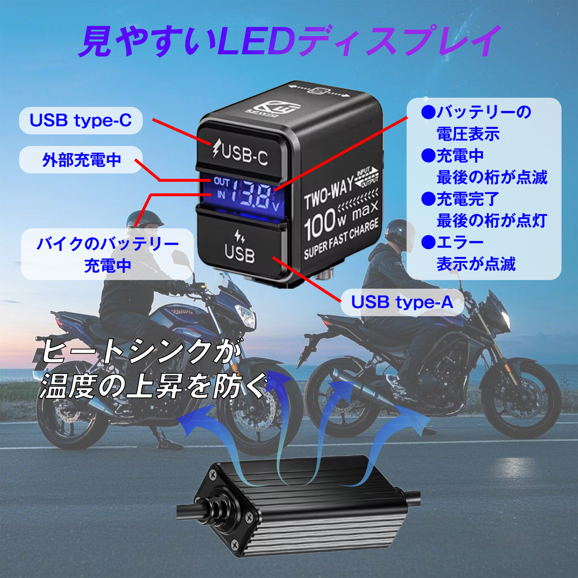 バイク USB電源 タイプA タイプC バッテリー充電 双方向 バイクUSB バイク用USB 防水 バイク用 バイクUSB電源 バイク電圧 バッテリー充電器 爆買