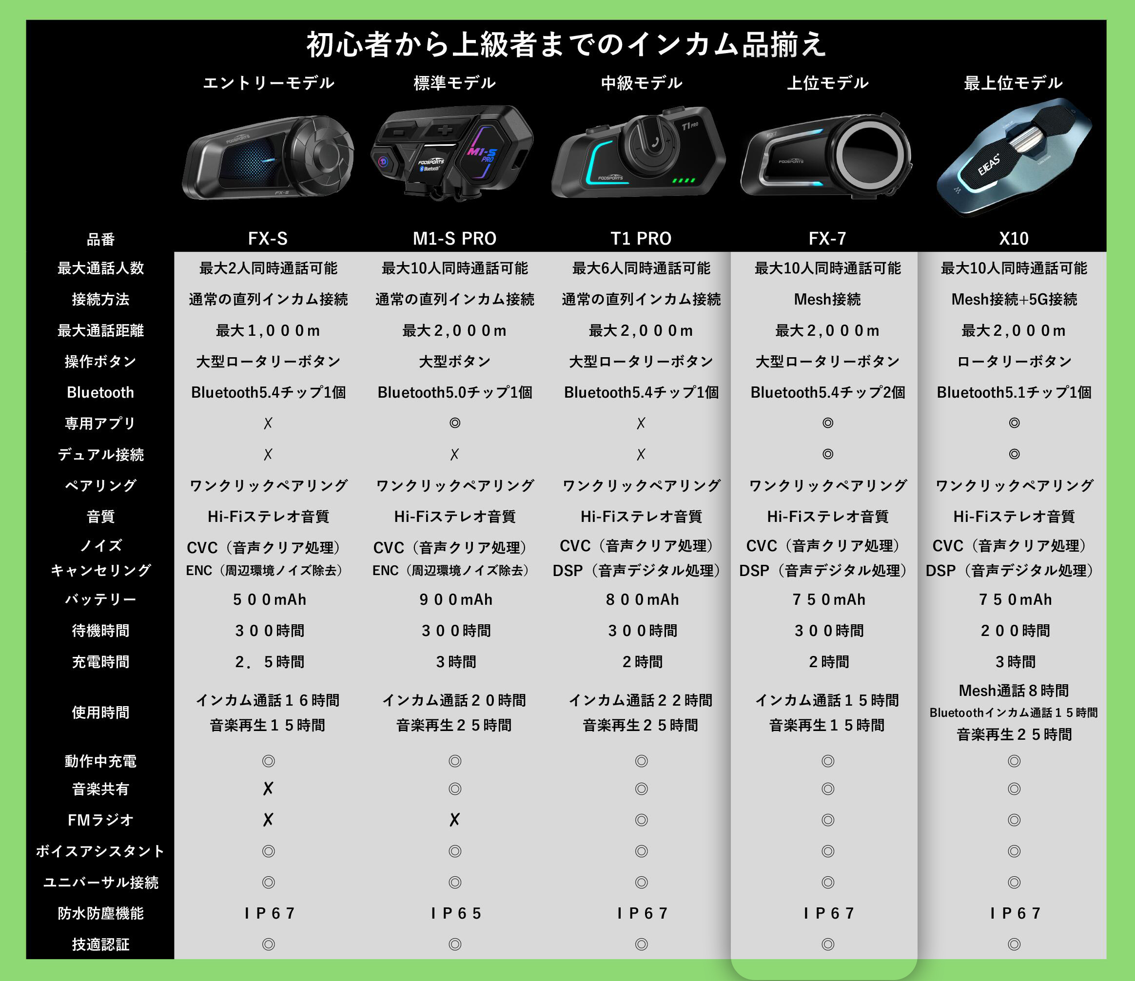| 1.次世代の接続技術〜 Mesh接続 〜 一般的なインカム接続は1台が抜けると切断されてしますことがありましたが、Meshu接続することで1台が抜けても 切れ間なく接続が継続し、抜けた1台が戻って来ると自動的にグループに復帰します。 2.コストパフォーマンスに優れた設計 最大10人との接続と同時会話が可能。Bluetooth5.4チップにより安定し且つ高音質な音声通話が可能です。 Bluetooth5.4チップにより時速120kmでも安定し且つ高音質な音声通話が可能です。 グループ通話は最大2,000m、2人間通話は最大1000mの接続ができます。 音楽共有機能により2人間でお気に入りの音楽を一緒に聞くことができます。 3.デュアルBluetooth Bluetooth5.4チップを2個搭載することで、インカム通話をしながら音楽鑑賞やナビ音声、FMラジオ等を同時に 楽しむことができます。 4.専用アプリ&ファームウェアーのアップデート スマートフォンに専用アプリをインストールしとFX7スマトーフォンを接続することで、FX7をスマートフォンから制御できます。 ファームウェアーをアップデートすることで、最新の機能をお楽しみいただくことが可能になります。 5.優れた音質 走行時の風切音やエンジン音・車の音など環境より会話が効きづらくならないようにCVC・DSP・ノイズ除去マイク等のノイズ除去 技術によりマイクから入力される音声及びスピーカーからの音声のノイズを除去し、聞き返しや聞き逃しによる ストレスから解放し、一日中ツーリングを楽しむことができます。 6.省電力バッテリー&充電しながら使用可能 750mAhの省電力バッテリー。充電コネクターはType-Cを採用 最新のBluetooth5.4チップを搭載することで省電力を実現しました。 モバイルバッテリーやUSB電源から充電しながらのインカム通話ができます。 |
