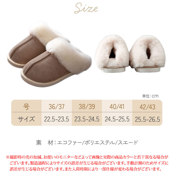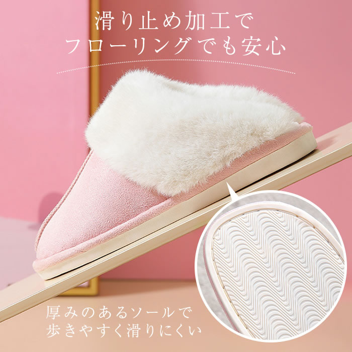 | ポイント | もこもこふわふわのファーで暖かいムートンスリッパ。インテリアに馴染むおしゃれでかわいいルームシューズで冬は暖かく夏はサラッと快適で過ごしやすい。滑り止め付きのラバーソールでフローリングでも安心。ご家族やカップルでお揃いにしてもかわいいルームシューズです。 |