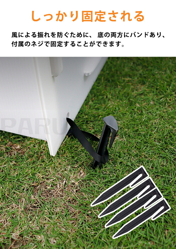 【しっかり固定される】風による振れを防ぐために、 底の両方にバンドあり、 付属のネジで固定することができます。